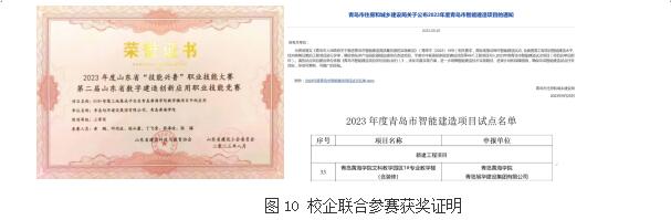 2023年,与青岛聿安顺工程管理有限公司等企业合作完成横向课题5项。与青岛旭华集团联合参赛,获山东省“技能兴鲁”职业技能大赛第二届山东省数字建造创新应用职业技能竞赛三等奖;第五届山东省建设工程BIM应用成果“高速德建杯”单项奖;青岛黄海学院文科教学园区1#专业教学楼(含装修)进2023年度青岛市智能建造项目试点名单。