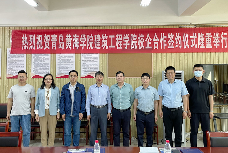 上海地铁咨询监理科技有限公司青岛分公司总经理郑万勇同青岛黄海学院建筑工程学院院长王来进行校企合作签约,王院长给企业领导颁发聘任证书并合影留念。