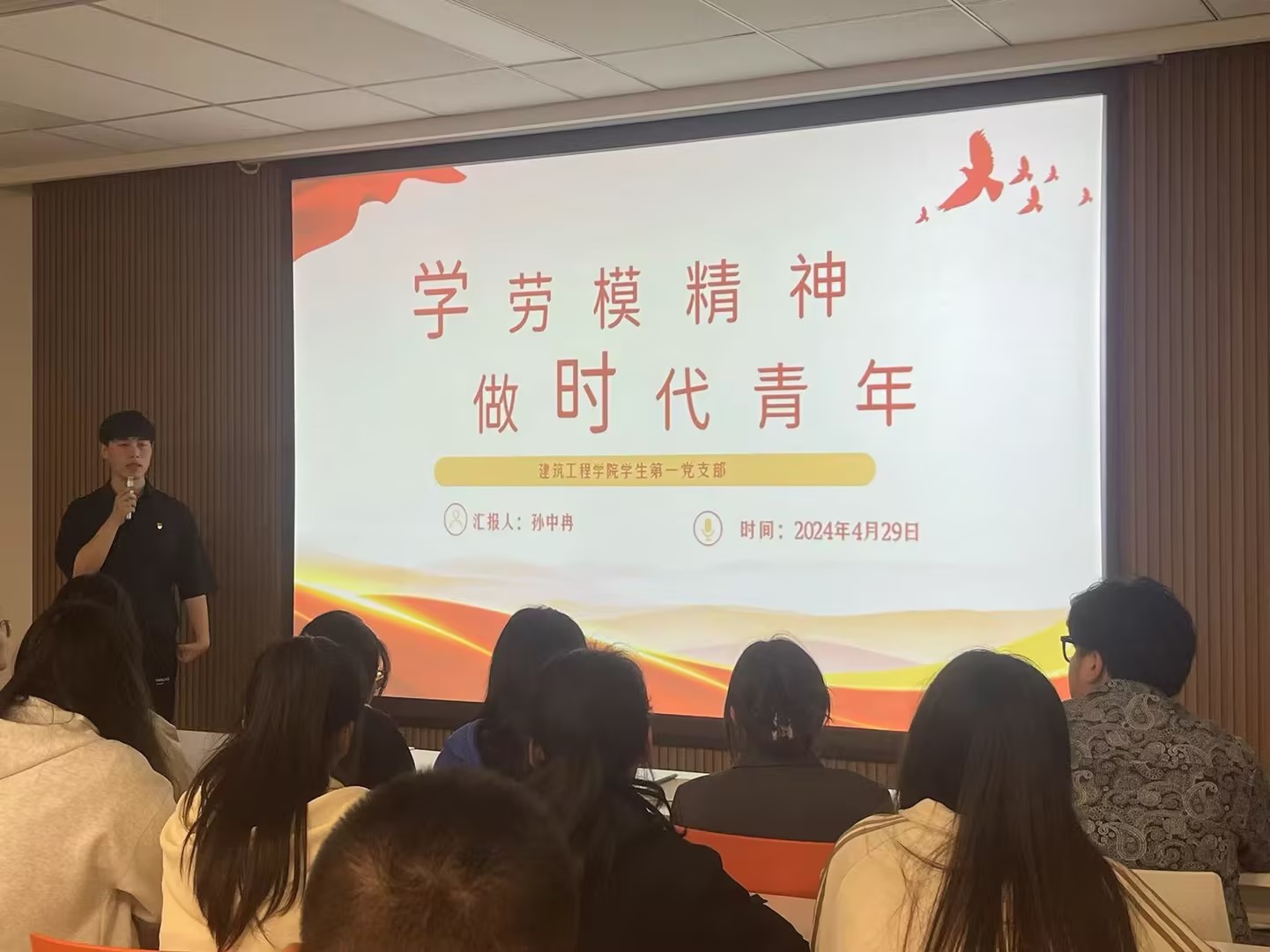 为弘扬劳模精神,五一劳动节来临之际, 2024 年 4 月 29 日晚19点建筑工程学院第一、第二党支部在知信楼 233 教室举办了以“匠心筑梦,劳模铸辉煌:弘扬新时代劳模精神”为主题的宣讲活动。建筑工程学院学生第一党支部党员赵海丞、孙中冉及2024年新发展的积极分子参加。