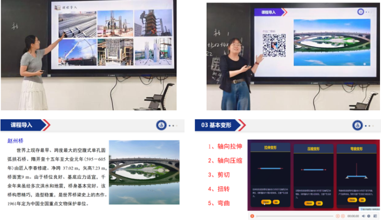 徐晨晨老师在《标准图集识读》课程的教学中,巧妙融入了多种数字化手段:课程开始,通过AI生成的三维动画引出下文柱钢筋类型;课堂讲授过程中,通过deepseek生成的提问指令对学生进行提问,增强与学生的互动;课后作业让学生使用AI助手对所发图纸进行信息识读,这些方式不仅提高了教师的备课效率,也有效激发了学生的学习兴趣。陈玉玲老师在《材料力学》课程的教学中,先借用AI软件生成了赵州桥的VR全景图进行课程导入,激发起学生对课程学习的极大兴趣,接着引入了材料力学的研究内容,即在保证材料的强度、刚度、稳定性的要求下,进行最经济的构件设计。随后讲授了进行材料力学的研究时用到的四个基本假设,即连续性假设、均匀性假设、各向同性假设和小变形假设,并引导学生利用AI软件进行该知识点的探讨。