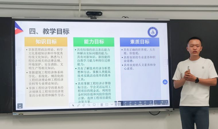 陈心老师就《建筑工程经济》课程进行了分享。他重点讲解了课程在项目投资决策、技术经济分析等方面的核心内容,说明了其与前后续课程的逻辑关系,并介绍了如何通过实际工程经济案例引导学生建立经济分析思维。