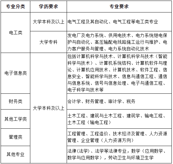 3.招聘岗位:主要安排在市县供电公司生产一线和支撑单位专业技术、技能岗位,包括:电网调控运行、输电运检、变电运检、城区配电、电力营销、带电作业、送变电施工、信息通信运维、工程建设技术等。