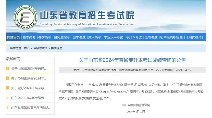 4月12日,山东省教育招生考试院发布《关于山东省2024年普通专升本考试成绩查询的公告》公布了2024年山东专升本考试成绩查询的时间具体的内容一起来看吧!