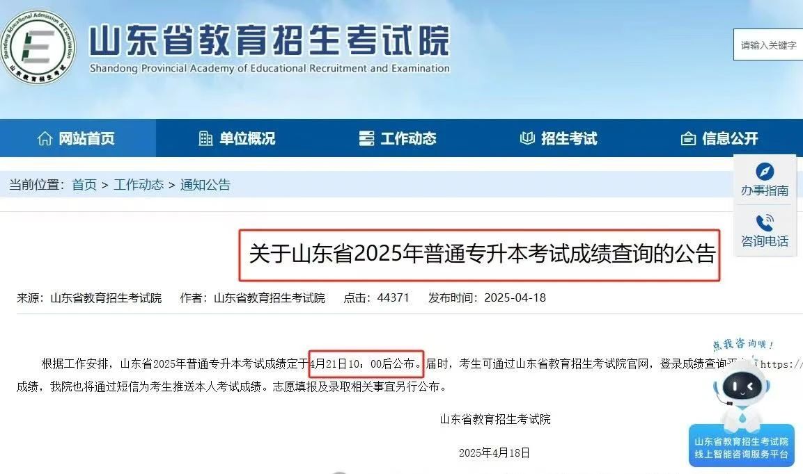 根据工作安排,山东省2025年普通专升本考试成绩定于4月21日10:00后公布。