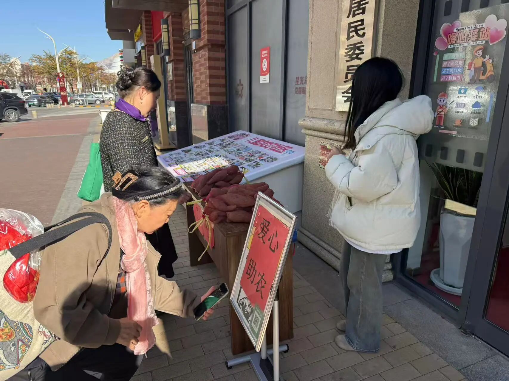 活动当天,销售点刚一开放便吸引不少居民。志愿者们身着志愿服,热情引导居民挑选,一边介绍:“这是本地农户种的蜜薯,蒸着软糯、煮着香甜!”一边向大家讲解助农意义,让居民知道每一份选购都是对农户的支持。真诚的态度打动了不少人,现场满是暖意。