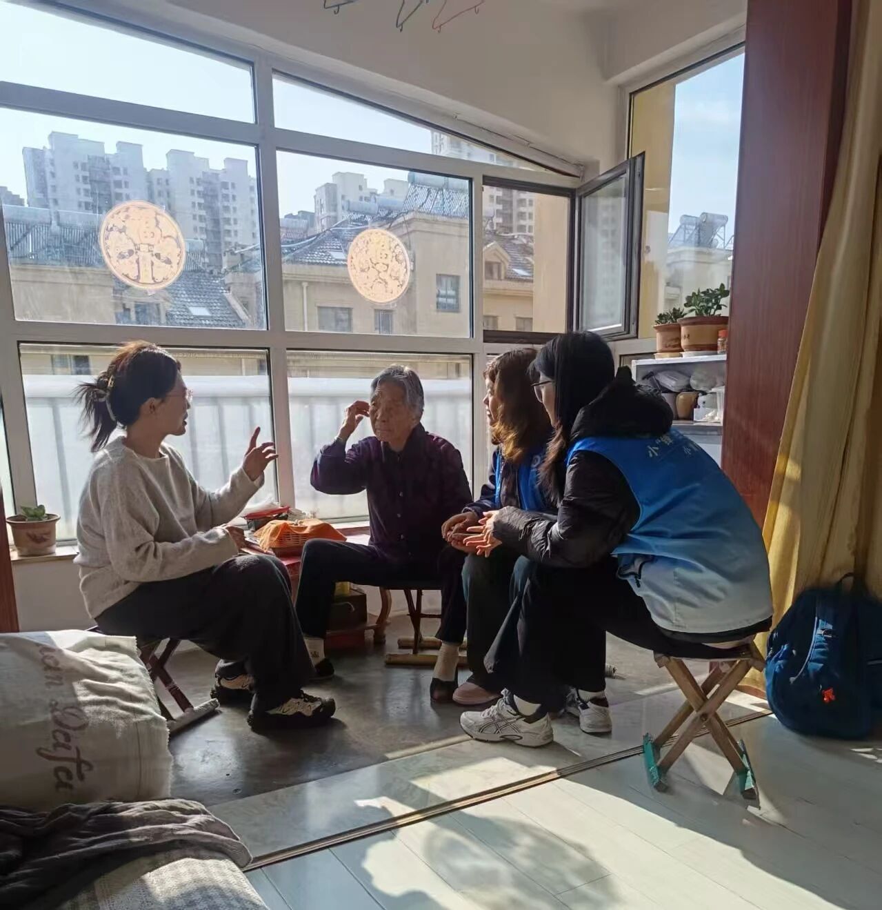 志愿者们和老人围坐在阳光满洒的阳台上,倾心交谈,认真倾听他们的心声。有的老人缓缓讲述着年轻时在田间劳作的趣事,有的则回忆起养育子女的艰辛与甜蜜,志愿者们时而点头回应,时而轻声提问,用温暖的眼神鼓励老人畅所欲言。他们促膝长谈,分享着彼此的故事。
