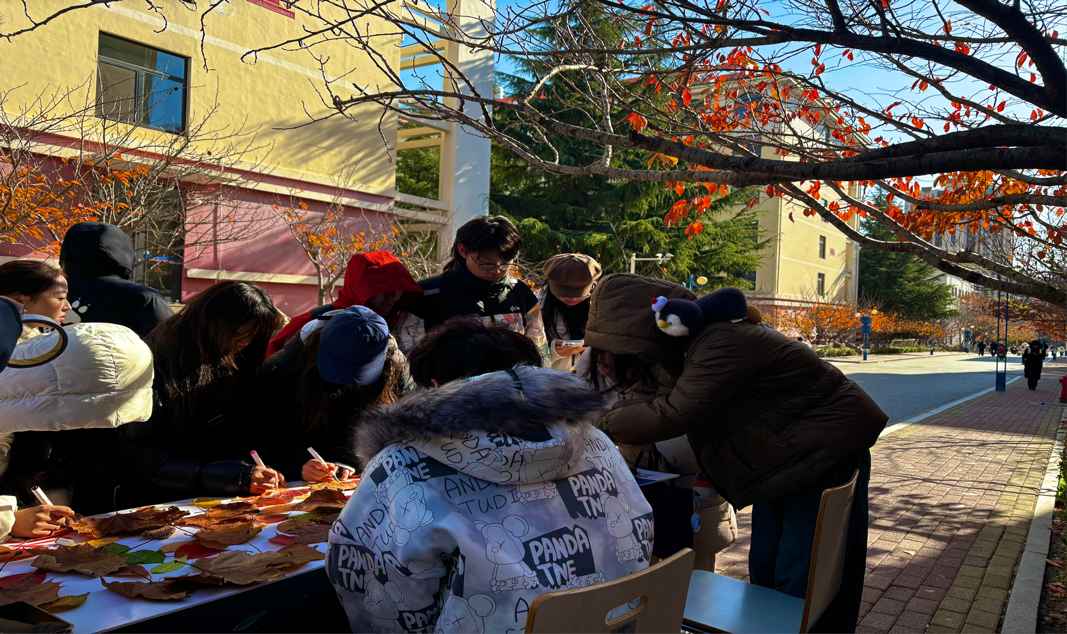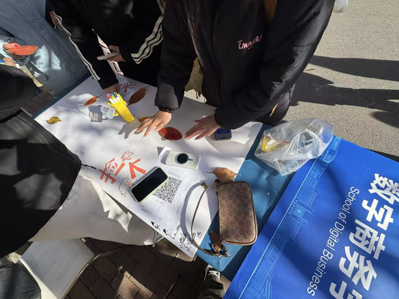 当秋风掠过校园,银杏染金、枫叶铺红,满地落叶不是萧瑟,而是大自然馈赠的创作原料!为捕捉秋日限定美好,丰富校园生活,我们抓住秋天的尾巴发启大学生落叶手工拼贴画活动,邀你用一双巧手,将散落的秋意拼成独一无二的艺术作品。11月27号,樱花大道3号楼下午数字商务学院举行“叶韵冬至,创意无限”线下活动写心声的队伍排成长龙,大家带着对秋日创作的期待,争相参与这场浪漫的手工盛宴。