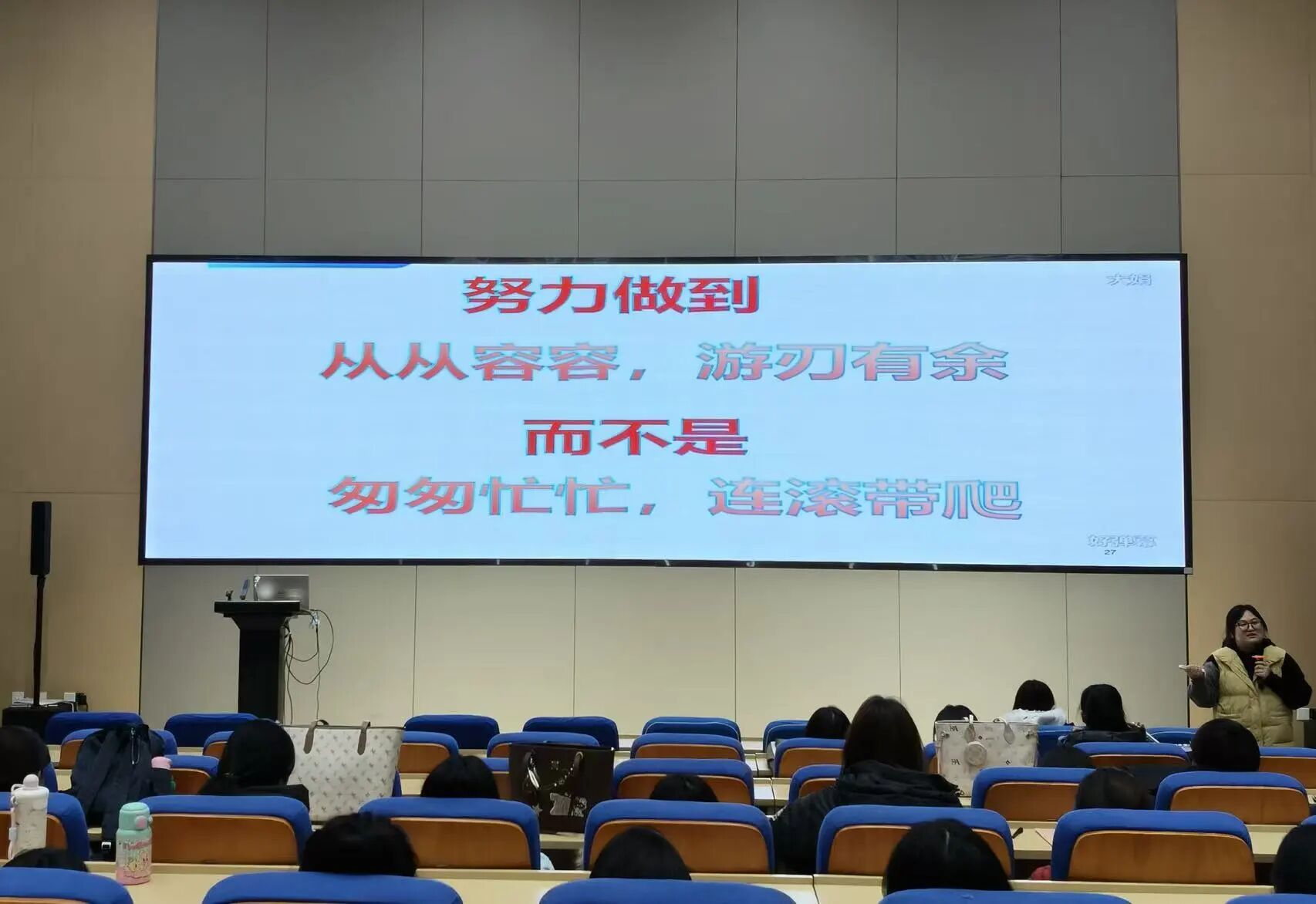 此外,报告会还系统梳理了各类 奖学金、荣誉称号的评奖评优政策与条件。孙主任勉励同学们,要以学业成绩为根基,全面发展,积极参与社会实践与专业竞赛,争取荣誉,为自己的大学生涯增添光彩。最后,用咬文嚼字发布的2025年十大流行语,鼓励学生要有韧性,努力做到从从容容、游刃有余,不要匆匆忙忙,连滚带爬。