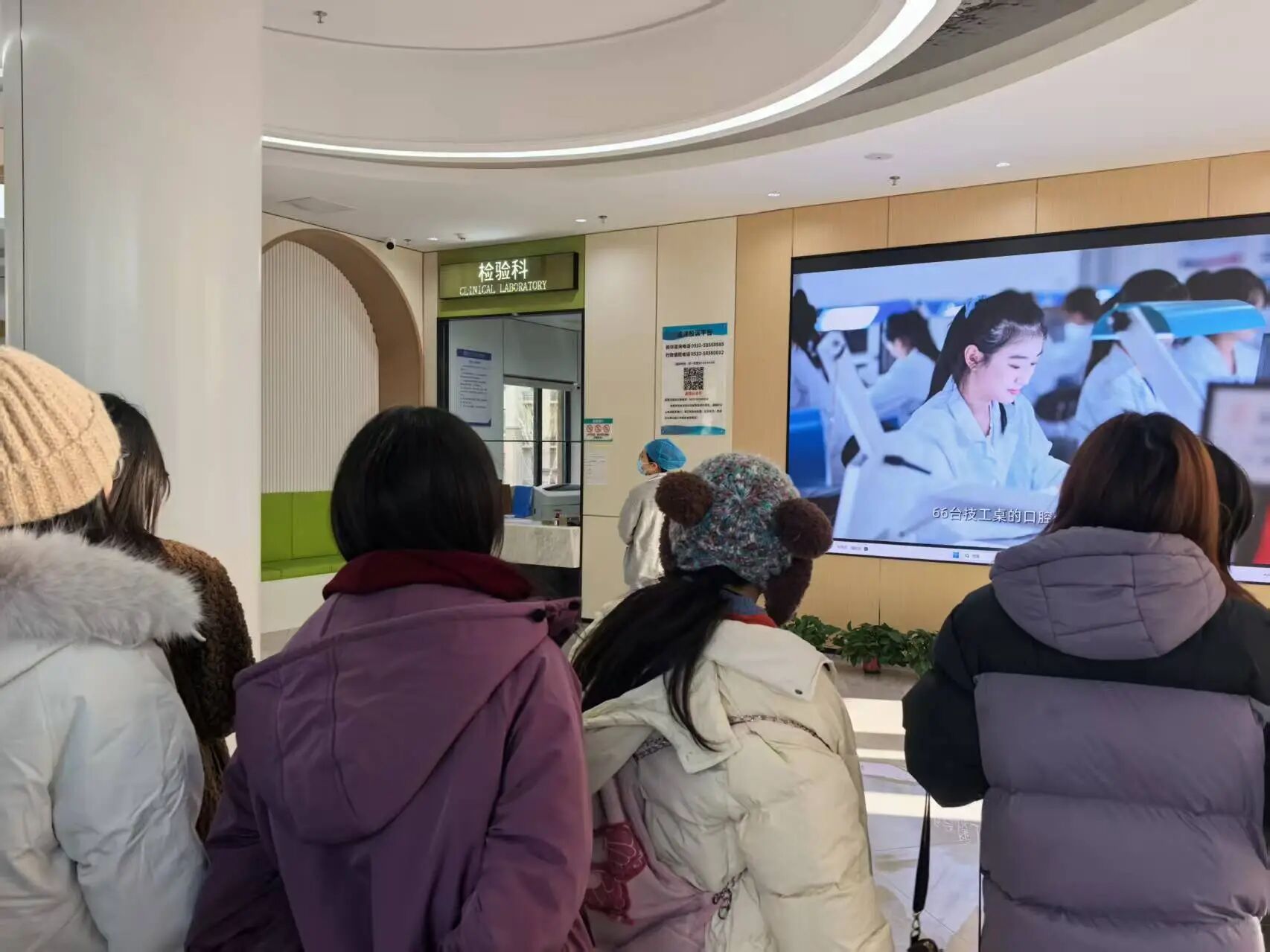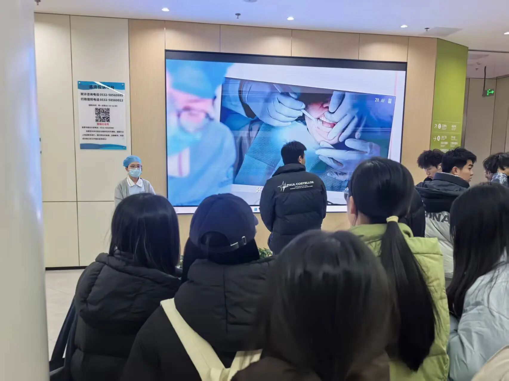 活动伊始,医院医护人员先通过巨幕显示屏,向同学们展示了牙科医疗团队的工作日常与高端诊疗设备的操作场景。当屏幕上出现医护人员专注进行口腔检测的画面时,不少同学前倾身体、目不转睛,有的拿出手机记录设备细节,有的低声讨论着诊疗流程的规范,现场弥漫着浓厚的学习氛围。随后,在工作人员的引导下,同学们来到检验科区域,透过窗口观察科室的工作布局,听讲解人员介绍口腔检测的样本处理、数据分析等环节,大家不时点头回应,或是主动询问专业相关的问题。