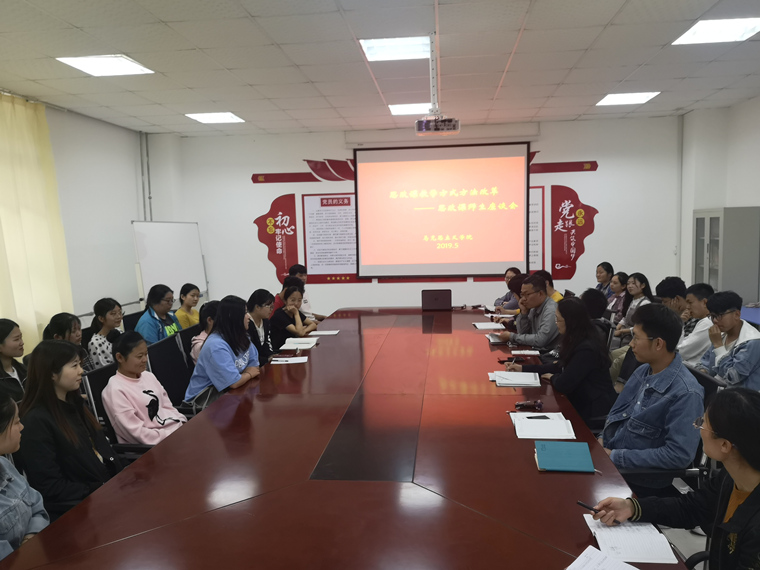 2019年5月9日下午,马克思主义学院召开师生座谈会,座谈会以思政课教学方式方法改革为主题进行,概论教研室主任李文敏主持会议,她鼓励学生代表勇于表达心中困惑,为思政课教学改革、提高思政课教学实效积极献言献策。