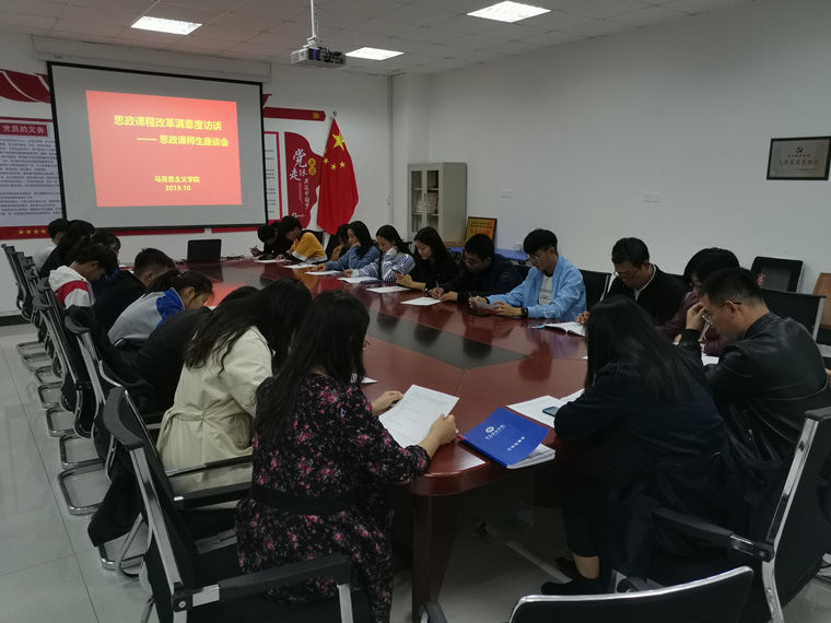 10月31日,马克思主义学院组织2019级本专科、2018级本科各专业学生代表以及思政课教师在208会议室召开以“思政课程改革满意度访谈”为主题的师生座谈会,就如何更好地推进思政课教学改革问题进行了深入探讨和交流,座谈会由李文敏老师主持。