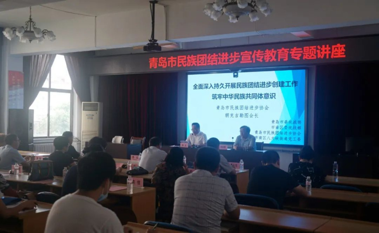 青岛市民族团结进步协会会长、青岛黄海学院马克思主义学院院长朝克吉勒图教授围绕全面深入持久开展民族团结进步创建工作,铸牢中华民族共同体意识,深入浅出分析了开展民族团结进步创建工作的重要性和必要性,系统讲述了构建中华民族共有精神家园的政策理论、历史进程和实践要求。讲座后,街道、社区领导介绍了少数民族人口概况及民族工作情况,朝克教授对街道、社区提出的问题进行答疑解惑,同时,针对基层民族工作中遇到的困难和问题,会员代表们纷纷建言献策,为街道、社区开展民族工作提供了新思路、新方法。最后,市委统战部向街道赠送了民族政策法规和民族知识手册,市民族团结进步协会向街道赠送了宣传彩页、争做民族团结进步模范倡议书等。