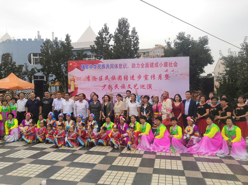 随后观看了李沧区民族团结进步宣传月暨少数民族文艺巡演,来自李沧区藏族、朝鲜族、蒙古族、维吾尔族和汉族的50余名演员以歌舞、曲艺、打击乐等艺术形式演出了10余个民族特色节目,充分演艺了各民族歌唱党、歌唱祖国,各民族交往交流交融持续深化,为促进我市各民族中华民族一家亲、同心共筑中国梦营造了浓厚氛围。最后,各位领导与全体演职人员合影留念。