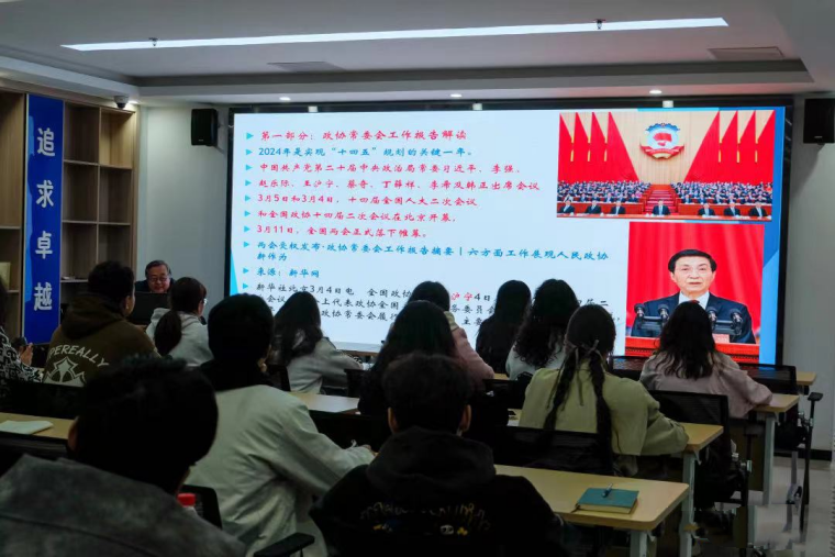 本次讲座围绕“政协常委会工作报告解读”“政府工作报告要点解读”“2024年全国两会上习近平总书记的关切事”“《政府工作报告》新看点”4个方面,以独到的哲学视角,鲜明的观点,丰富的案例,从国内到国际,从经济到政治,从文化、社会到生态等多个角度,详细解读了两会的热点议题,让全体同学对中国过去一年的主要成就和2024年重点工作,及习近平总书记两会讲话精神有了更深刻的认识和理解。