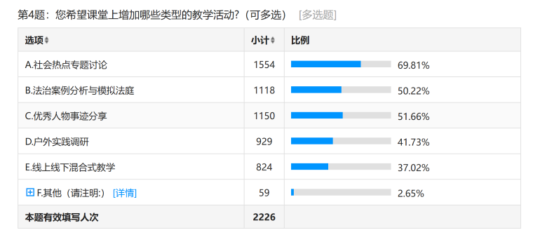 在教学改进需求方面,学生意见集中指向实践化、多元化与互动化。45.19%的学生希望减少纯理论讲授、增加实践案例,42.68% 的学生建议丰富情景模拟、辩论赛等教学形式,29.83%的学生期待更多课堂互动与讨论机会。新增教学活动需求呈现“重实践、追热点”特点,69.81%的学生希望增加社会热点专题讨论,优秀人物事迹分享(51.66%)、法治案例分析与模拟法庭(50.22%)等实践类活动也获得较高支持率。