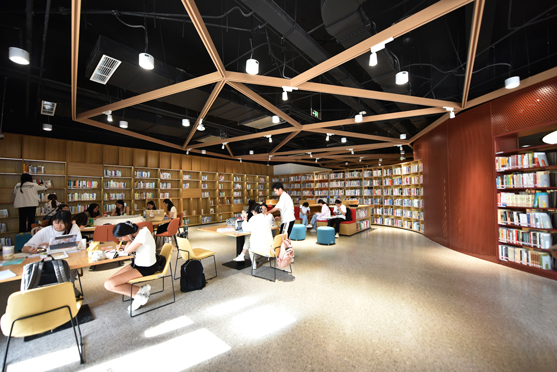 “阅享空间”位于西区18-21号宿舍楼之间,该区域是集图书阅览、学习交流、学生一站式服务、运动健身、心理辅导、休闲娱乐、餐饮购物等多功能于一体的多元集合空间,充分满足师生个性化、多样化的学习生活需求。学校充分发挥环境育人作用,从师生实际需求出发,将绿色环保、人文关怀、艺术审美、智慧化管理与服务的发展理念融入“阅享空间”的每一个角落,营造独具特色的校园文化风格,实现功能性、人文性、艺术性相统一。书桌上配有电源插口、USB接口和触摸灯开关。灯光可根据读者需求自行调节亮度,智能感应、光度柔和、没有阴影,带给读者最舒适、安心的学习和阅读体验。“阅享空间”配备咖啡屋、便利店、书屋、健身房等, 赋能“悦读”新体验。浓郁的咖啡香味,搭配各类赏心悦目的美食,书香氤氲,使阅读和学习成为一件快乐幸福的事情。