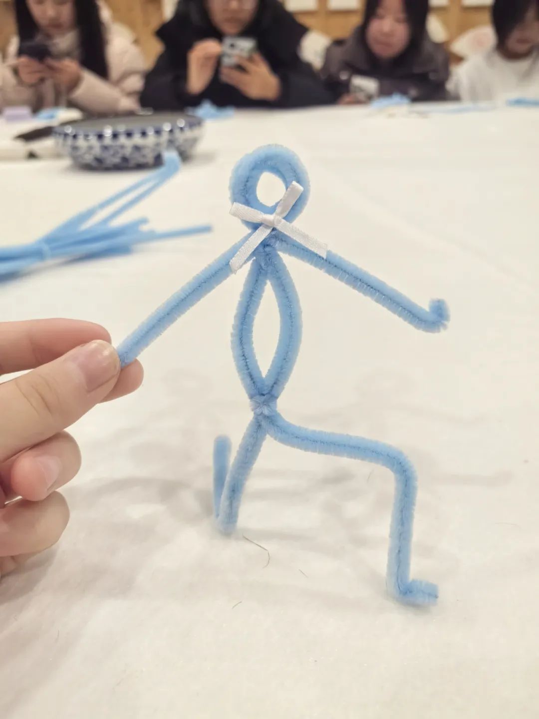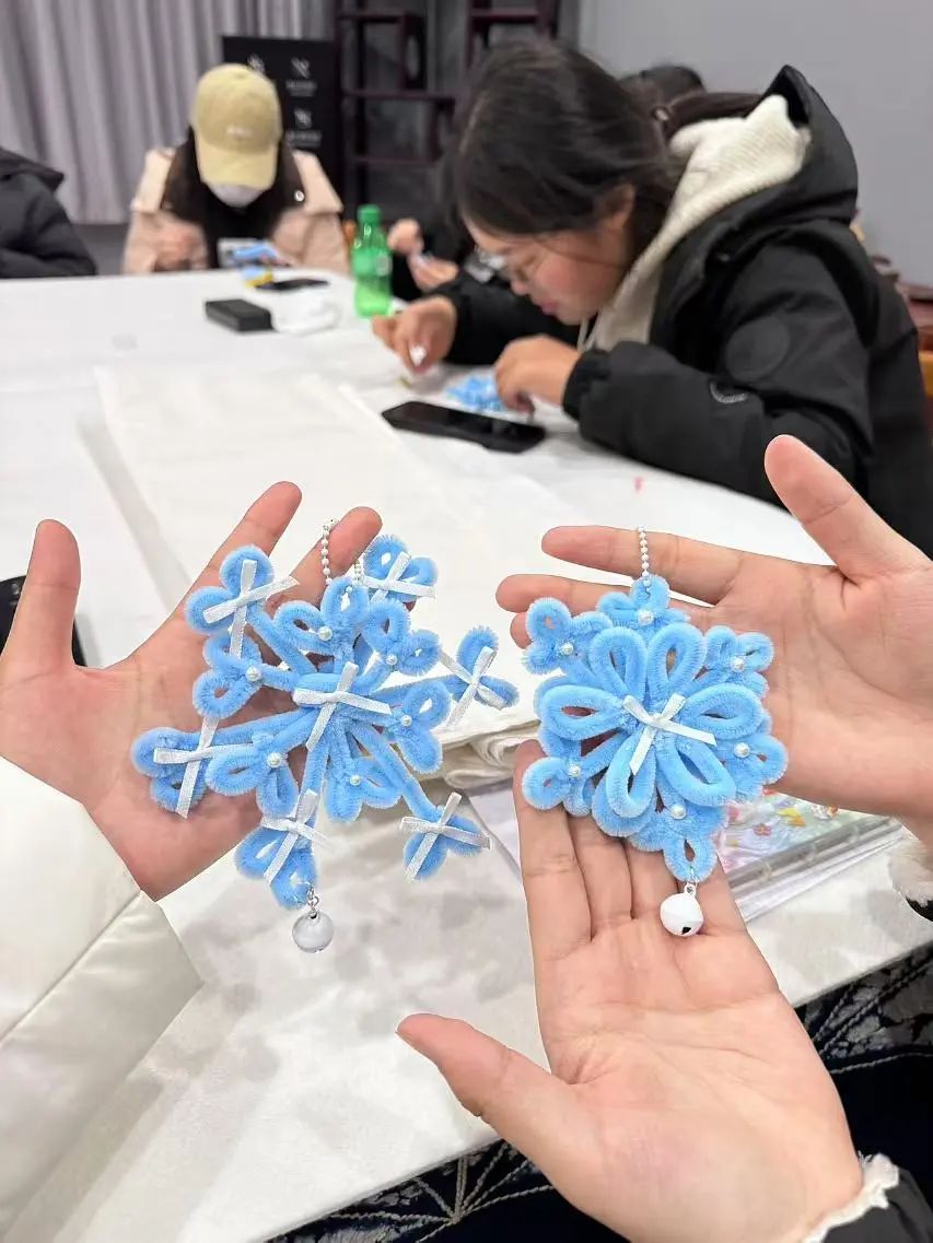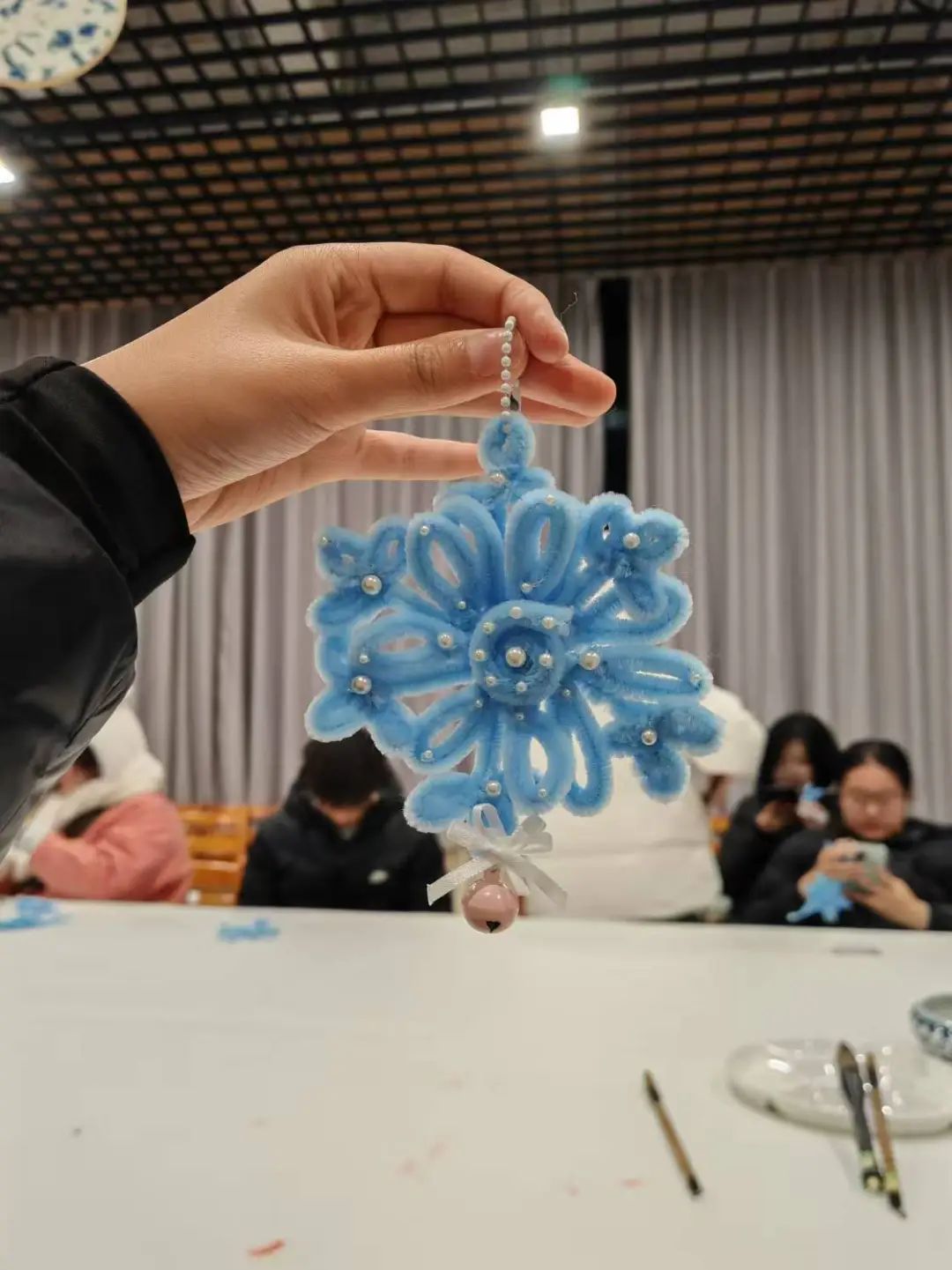为此,我们还特别安排了一个小型展览环节,邀请部分参与者前来分享自己的作品及其背后的故事灵感。顾依桐拿着自己制作的雪花作品,兴奋地说道:“扭扭棒做雪花比较简单,大家都能够参与进来,在博物馆的文创区域做雪花也很应景,这种手工活动氛围轻松愉悦,在制作过程中,可以专注于手工,暂时忘却学习中的压力和烦恼,享受手工制作带来的乐趣。而且能增进我们之间的感情。大家在共同创作、互相帮助、分享创意的过程中,能够更快地熟悉起来,从而增强整个团队的凝聚力和归属感。”