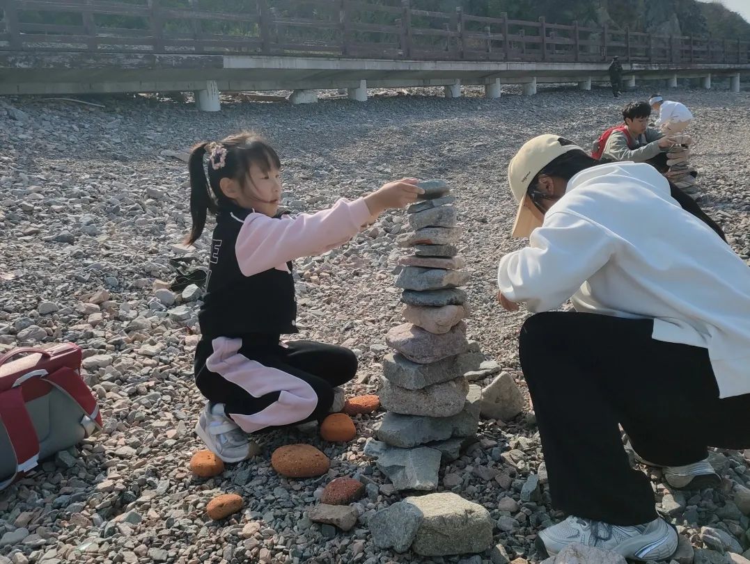 饭后继续行进,来到了角子石灯塔海滩,这里成为了孩子们的欢乐天堂。赶海,是孩子们最期待的环节。大家迫不及待地冲向海滩。在退潮后的沙滩上,隐藏着许多小惊喜:小螃蟹在沙滩上快速穿梭,蛤蜊藏在沙下若隐若现,还有各种各样的贝壳散落在沙滩上。孩子们弯着腰,仔细地寻找着,每发现一个 “宝藏”,都伴随着一阵欢呼。