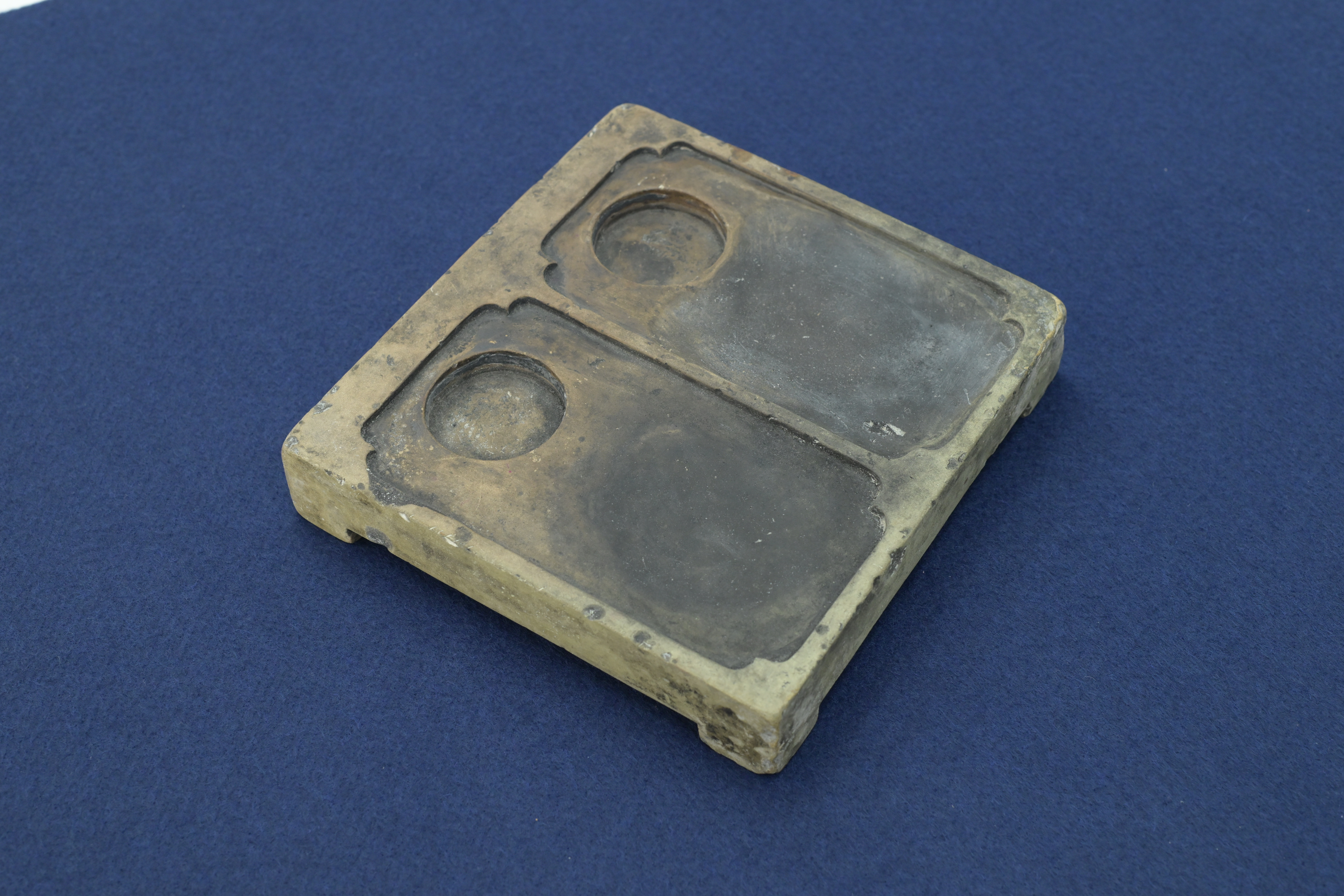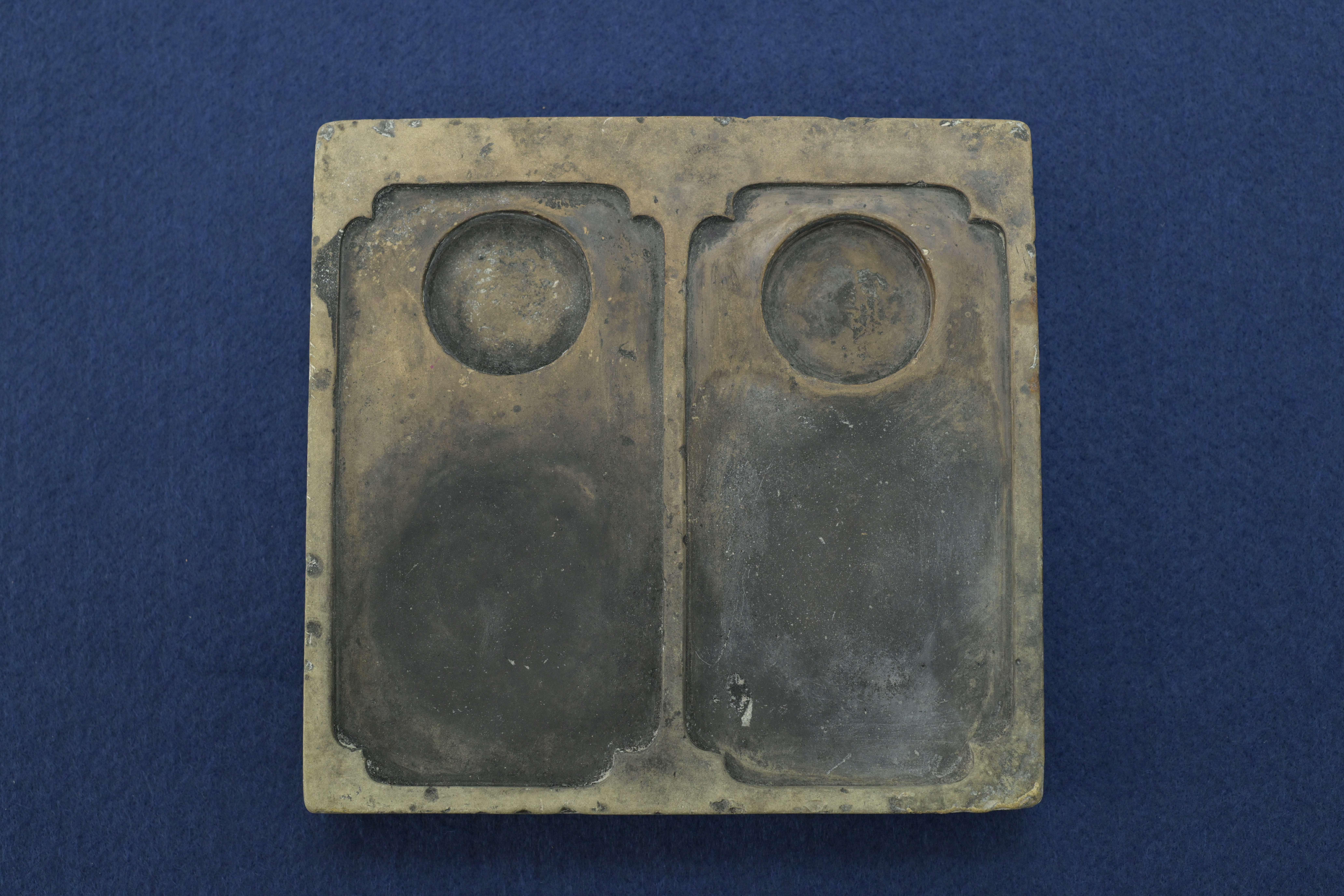 砚面呈现出双池的独特造型,两个砚池规整排列,池沿线条流畅自然。这样的设计,不仅满足了研磨不同墨色等实用需求,更在对称布局中,展现出明代制砚工艺对形式美感的追求,仿佛在静默中诉说着古人于文房之事上的精致用心。