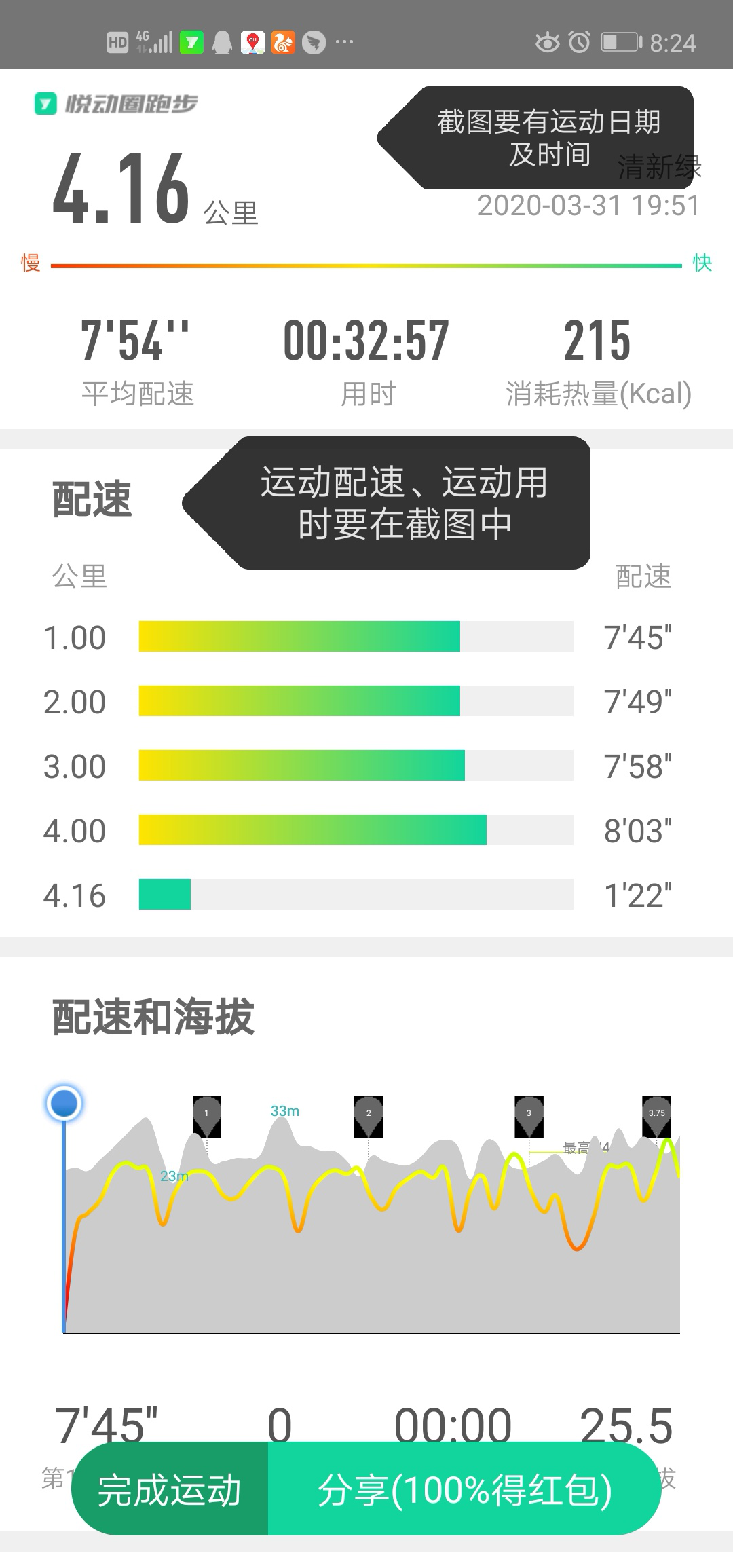 1、建议学生下载运动APP(如悦动圈、悦跑圈、咕咚、KEEP、QQ运动等)参与运动,运动后进行截屏+运动前、后的自拍面部照片。要求每次跑步至少3公里,配速在8分20秒之内。(学生必须保证数据的真实性,一旦发现作弊,取消期中考试成绩)