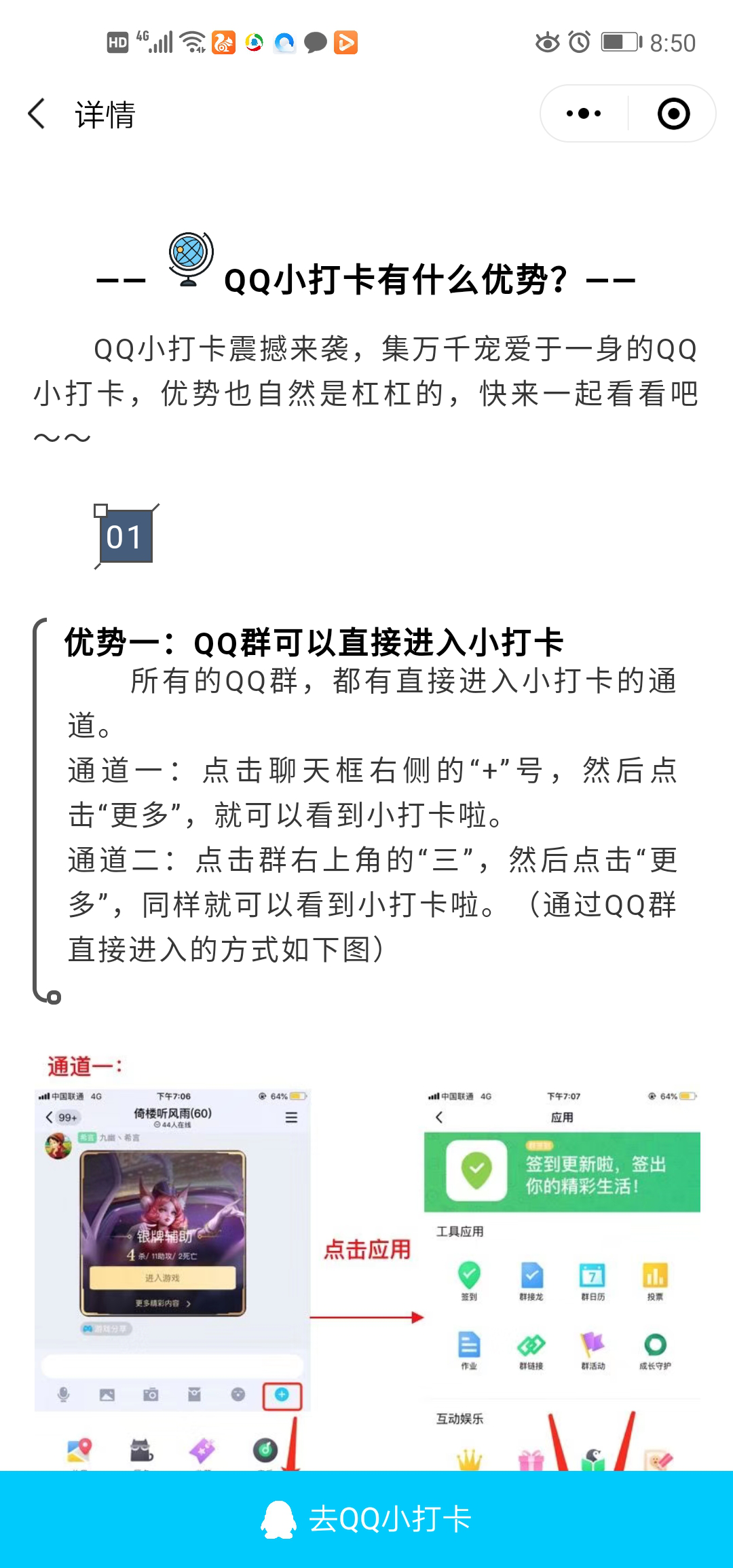 3、微信搜索小打卡--建打卡圈,QQ小打卡查找方式见下图(搜索小程序)。(建议任课班级多的老师多建几个圈子,以便后期的统计)