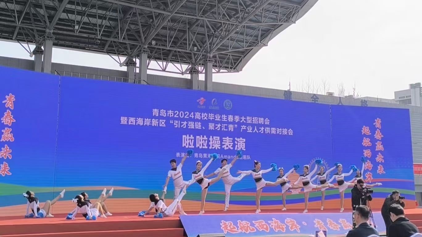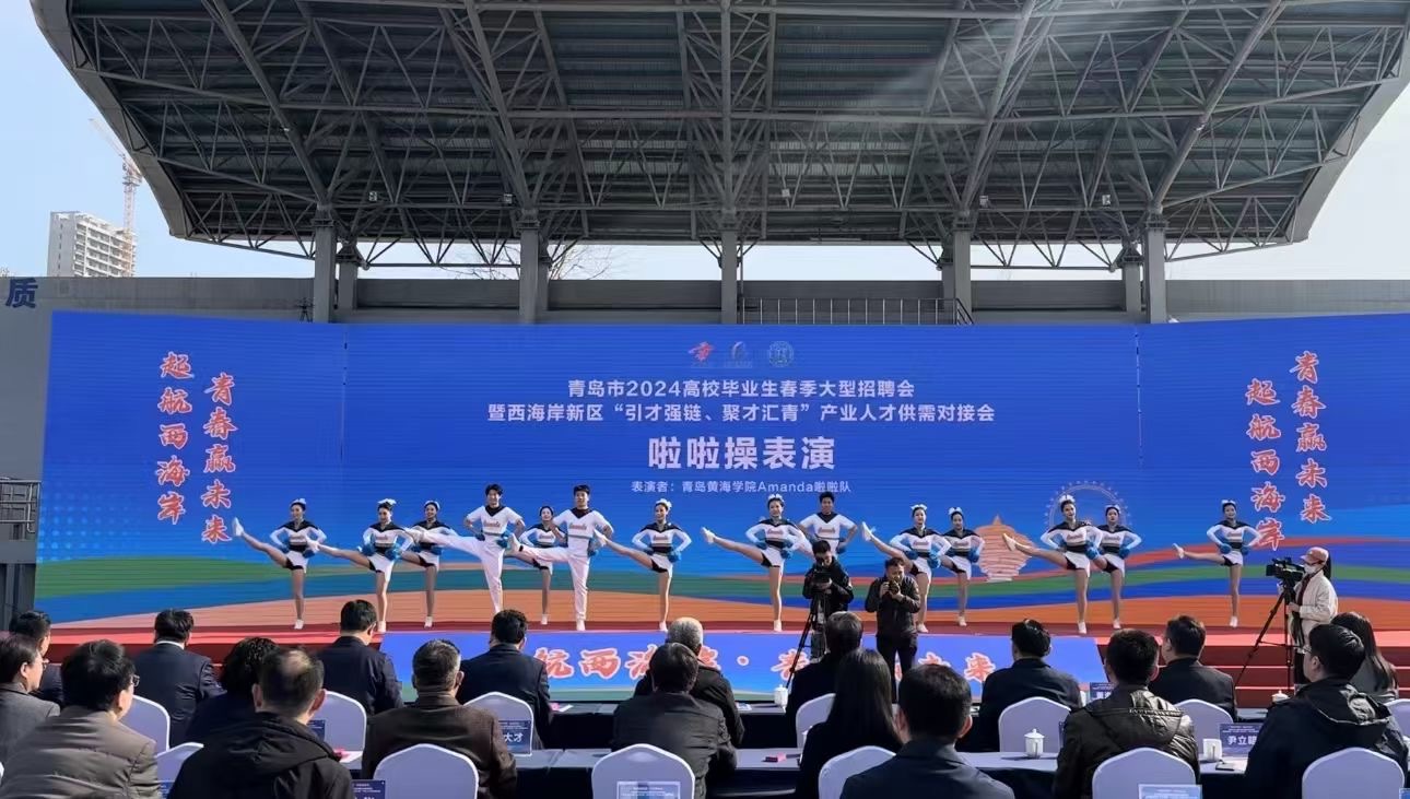 3月23日,青岛黄海学院Amanda啦啦操社团助力青岛市高校毕业生春季大型招聘会暨西海岸新区“引才强链、聚才汇青”产业人才供需对接会开幕式在青岛石油大学举行。本次活动由青岛市公共就业和人才服务中心、青岛西海岸新区人力资源和社会保障局、中国石油大学(华东)学生就业指导中心等单位主办。祝贺本次活动圆满成功!