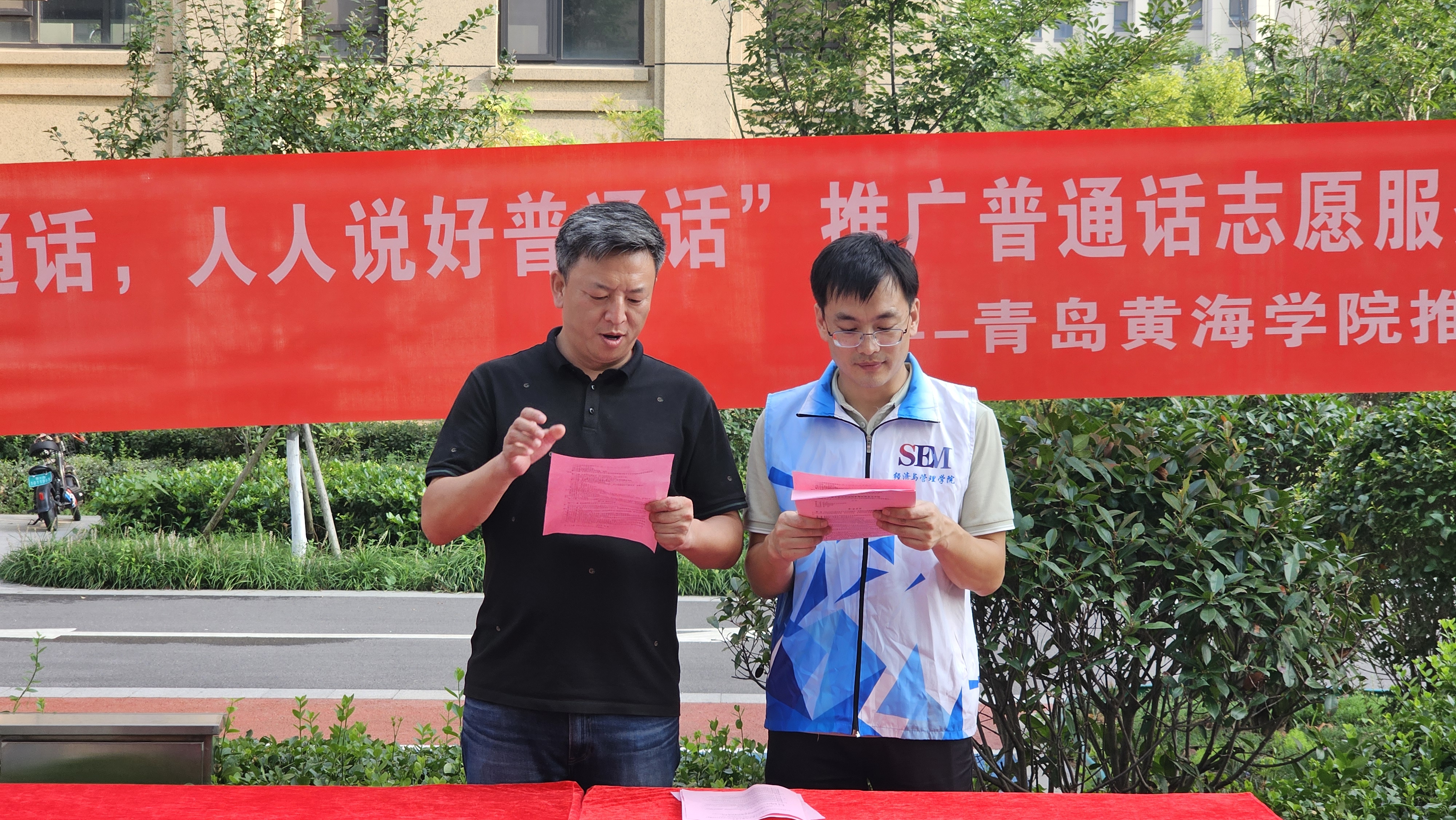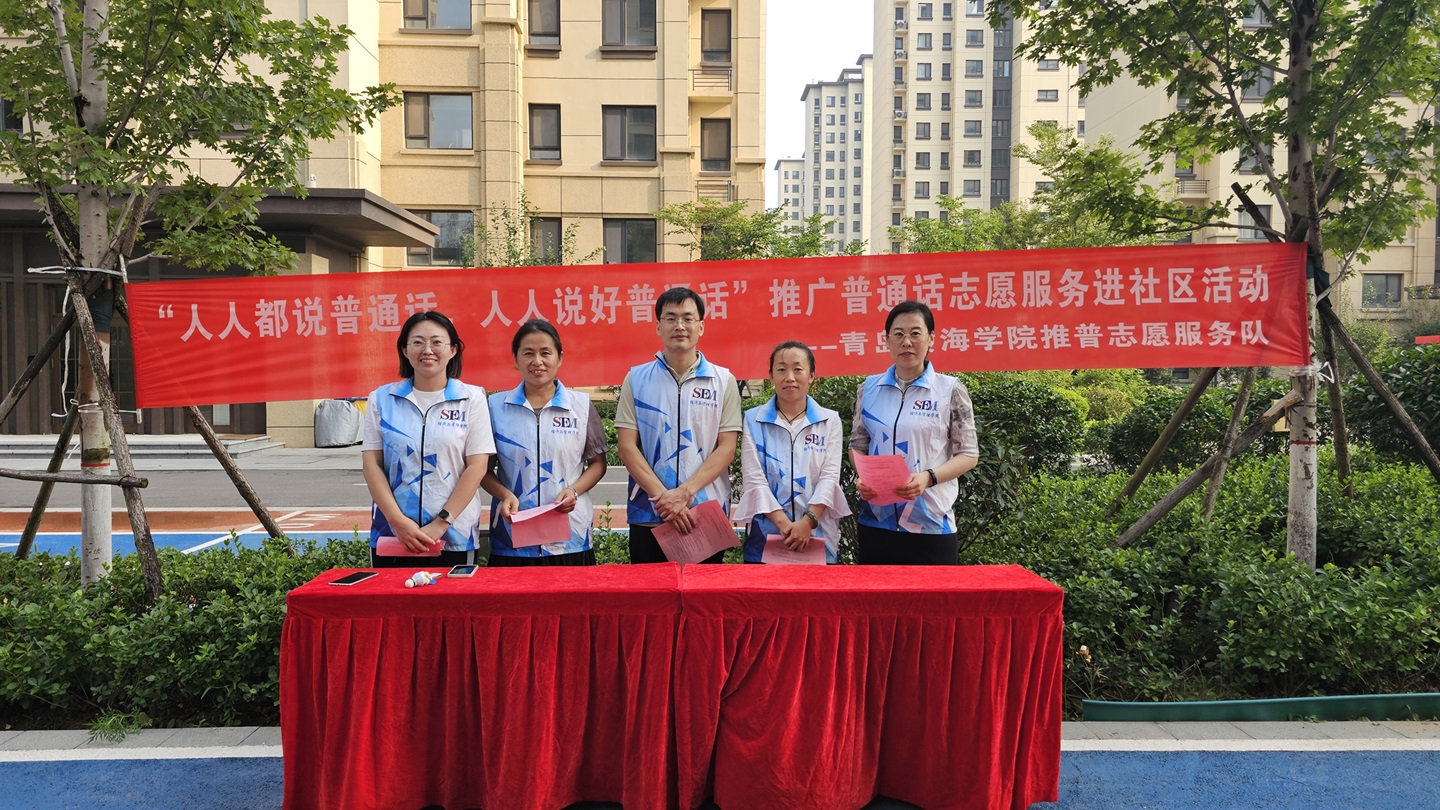 青岛黄海学院于2024年8月22日组织5名普通话测试员志愿者在灵山卫街道办事处山海嘉园小区举办了“人人都说普通话,人人说好普通话”的社区推普志愿活动。活动旨号召群众都说普通话、说好普通话,使普通话真正成为学习语言、工作语言、生活语言。