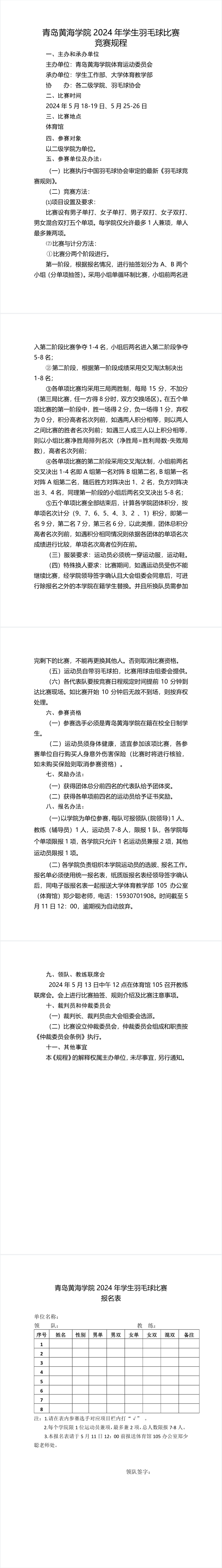 青岛黄海学院2024年学生羽毛球比赛竞赛规程