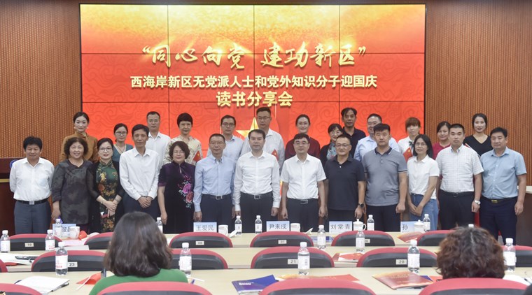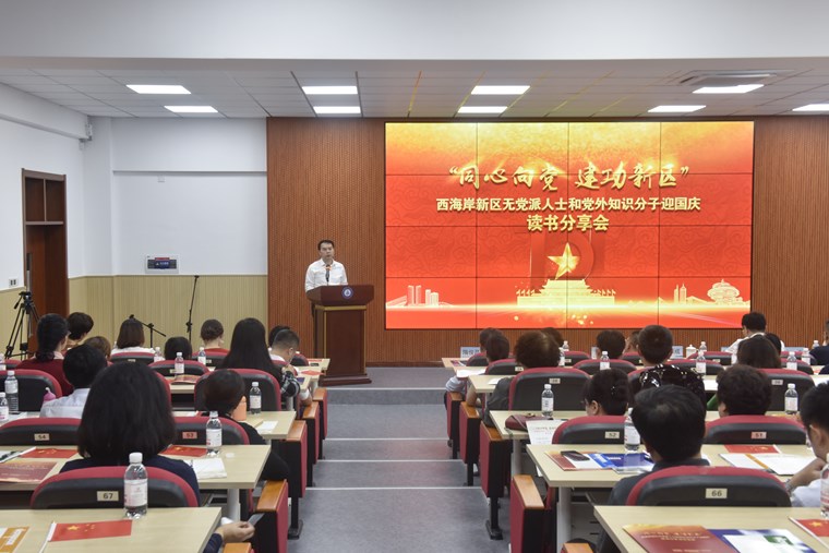 9月28日下午,“同心向党 建功新区”西海岸新区无党派人士和党外知识分子迎国庆读书分享会,在我校知新楼二楼东配多媒体教室举行。区工委统战部部长尹来成、常务副部长王爱民、副部长刘璇,区知联会常务副会长隋俊昌出席读书会,2021年度认定的无党派人士、党外知识分子联谊会、张家楼街道知联会、长江路街道知联会、青岛黄海学院知联会会员代表、特邀新阶层“家在黄岛”文化传承服务团等60余人参加了此次活动。青岛黄海学院董事长刘常青,青岛黄海学院知联会副会长谭春波、尹成波、徐哲参加读书会,本次活动由青岛黄海学院知联会副会长尹成波主持。
