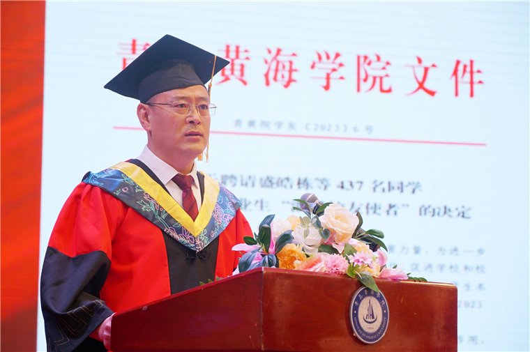 王渊明校长以《奋楫笃行 奔赴远方》为题在毕业典礼上致辞。他代表学校,向圆满完成学业的2023届毕业生致以最热烈的祝贺!他表示,同学们是黄海发展的亲历者,同样的,黄海也是你们成长的见证者。四年来,同学们惟德惟能,勤勉苦读,积极进取,逐梦创新,书写了最美的黄海青春故事!