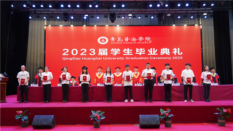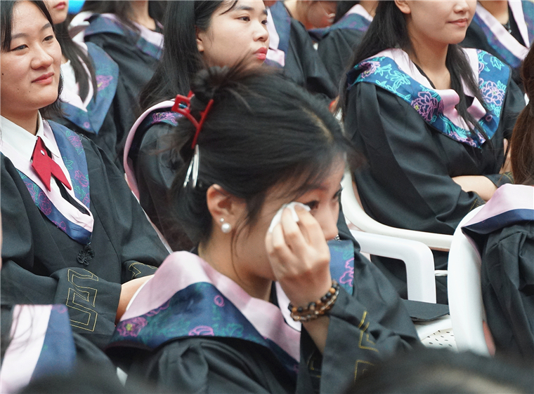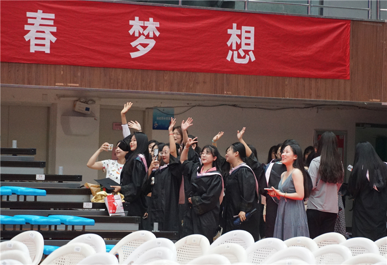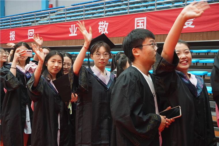 毕业典礼结束后,学校领导、老师们全体起立,与毕业生挥手告别,目送毕业生们依次离场。一声声“再见”,一句句“祝福”,在黄海上空久久飘扬。