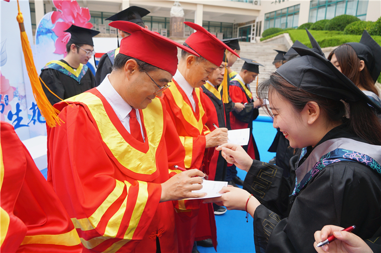 典礼开始前,学校领导班子成员与部分毕业生代表合影留念,并在明信片上为他们写下祝福寄语。