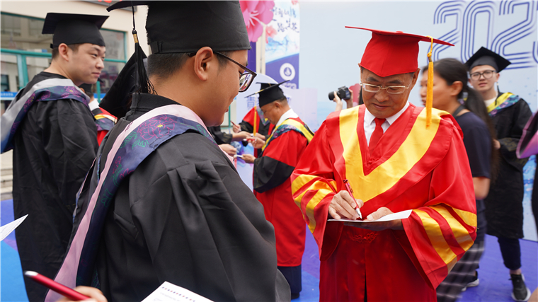 别离将至,远行在即,作为校长和师长,他将几点期望,作为临别寄语与毕业生们分享:一是希望大家坚定理想,矢志不渝,在磨炼中增长才干。心中有理想,眼前有方向,脚下才有力量。希望你们不论身在何处、从事什么职业,都能努力做一个眼里有星辰大海,胸中有丘壑万千、心中有阳光温暖,脚下有从容淡定的孤勇者,使自己的人生沿着正确的方向前进。二是希望大家与时俱进、勇于创新、在变革中展现作为。变化是世界的本质,不确定是生活的常态,如何在变化的世界中找寻自己,是你们一生永恒的主题。希望同学们面对世界和社会变局,自觉以战略思维谋划全局、以战略定力迎接挑战,结得“千层茧”,练就“冲天翅”,用主动求变创造未来的精彩人生。三是希望大家修身立德,勇毅前行,在实践中日益强大。人无德不立,品德是为人之本。希望你们在今后的道路上,不断提升自身修养,无论经历多少社会的敲打和磨难,依然能够保持在学校时的那份善良、真诚、无邪、进取、 宽容、博爱的初心,坚守求真向善、向善向美的本心,锤炼高尚品德,养成浩然正气。四是希望大家终身学习,积极进取,用奋斗点亮青春底色。毕业并不代表学习的结束,无论是考研深造,还是参加工作,都将迎来更加艰巨、更加长久的学习任务。希望同学们不断养成终身学习的习惯,牢记“业精于勤,荒于嬉”的古训,把学习当作一种精神追求、一种生活态度和一种行为习惯,真正做到知行合一,博学笃行。