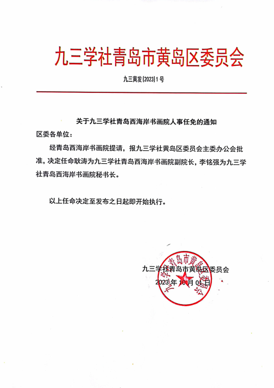 日前,九三学社青岛市黄岛区委员发文《关于九三学社青岛西海岸书画院人事任免的通知》(九三黄发【2023】1号),我校耿涛荣任九三学社青岛西海岸书画院副院长。