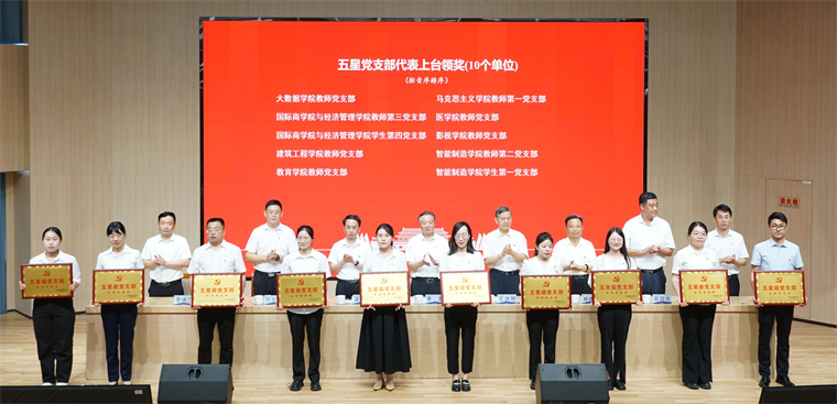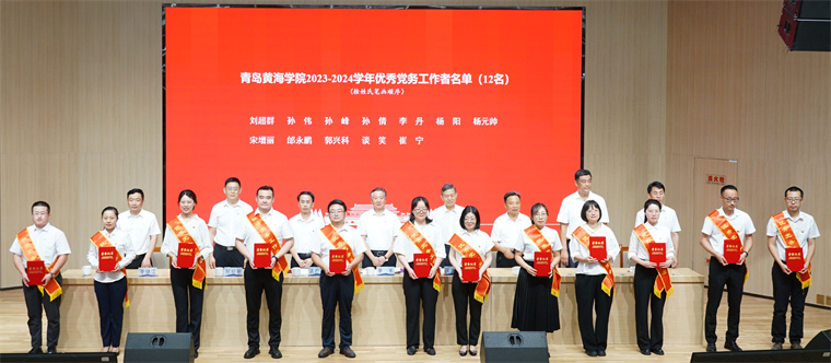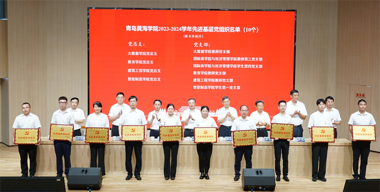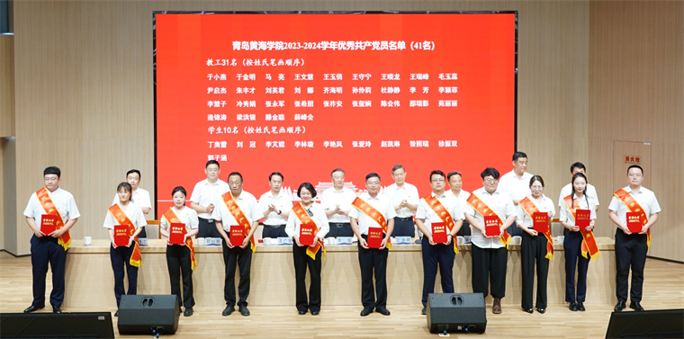 大会在庄严的国歌声中拉开帷幕。党委副书记、副校长孟广东宣读《中共青岛黄海学院委员会关于表彰2023-2024学年优秀共产党员、优秀党务工作者、先进基层党组织的决定》。学校党委领导班子分别为受到表彰的41名优秀共产党员、12名优秀党务工作者和10个先进基层党组织颁发了奖牌和荣誉证书。