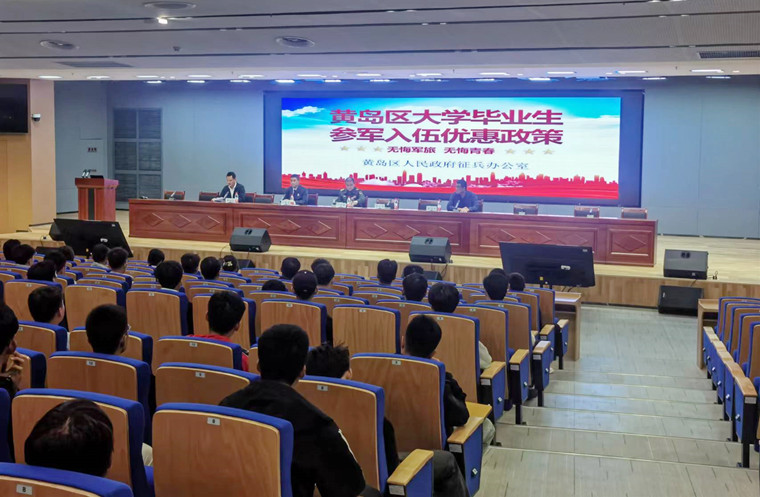 为帮助毕业班学生规划未来发展,了解更多参军入伍政策、优抚待遇及体检注意事项,提供专业指导和政策解答,不断提升学校征兵工作和国防教育的高质量发展,2023年11月3日下午,青岛黄海学院在知信楼1楼报告厅召开“无悔军旅、无悔青春”大学毕业生参军入伍优惠政策宣讲大会。黄岛区区委常委、区人民武装部政委闫明智、黄岛区人民武装部军事科科长徐敬光、学生工作部部长赵国光、武装部部长李桂臣、武装部樊明及各学院征兵负责人、有意向参军入伍毕业班学生230多人参加宣讲大会,会议由学校武装部部长李桂臣主持。
