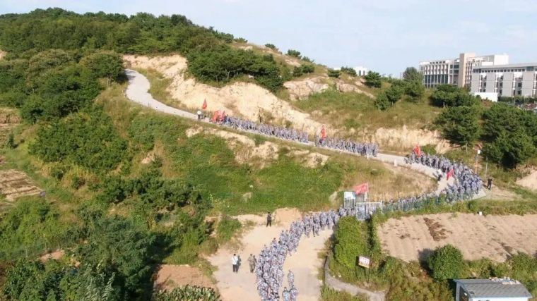 14日下午4点,拉练队伍在西区操场整装待发,同学们队伍严整、纪律严明、态度严肃,从起点有序上山。