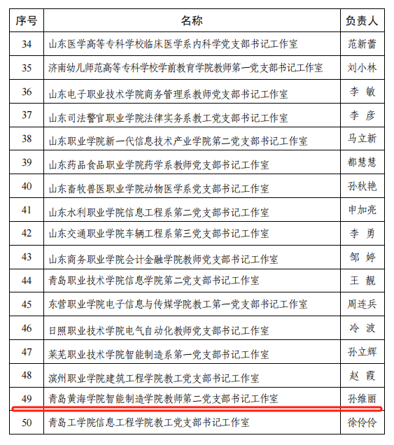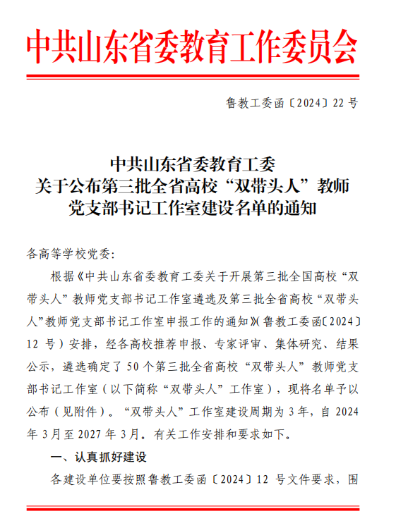 近日,中共山东省委教育工委公布第三批全省高校“双带头人”教师党支部书记工作室建设名单,智能制造学院教师第二党支部入选第三批全省高校“双带头人”教师党支部书记工作室建设名单(共50项)。