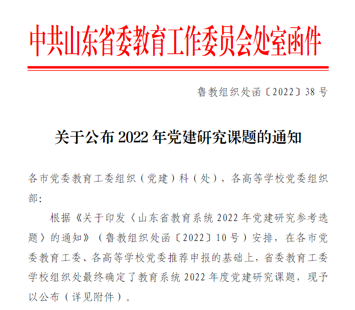 近日,山东省委教育工委下发《关于公布2022年党建研究课题的通知》,我校3项课题入选全省教育系统2022年度党建研究课题,获重点课题立项2项、一般课题立项1项。