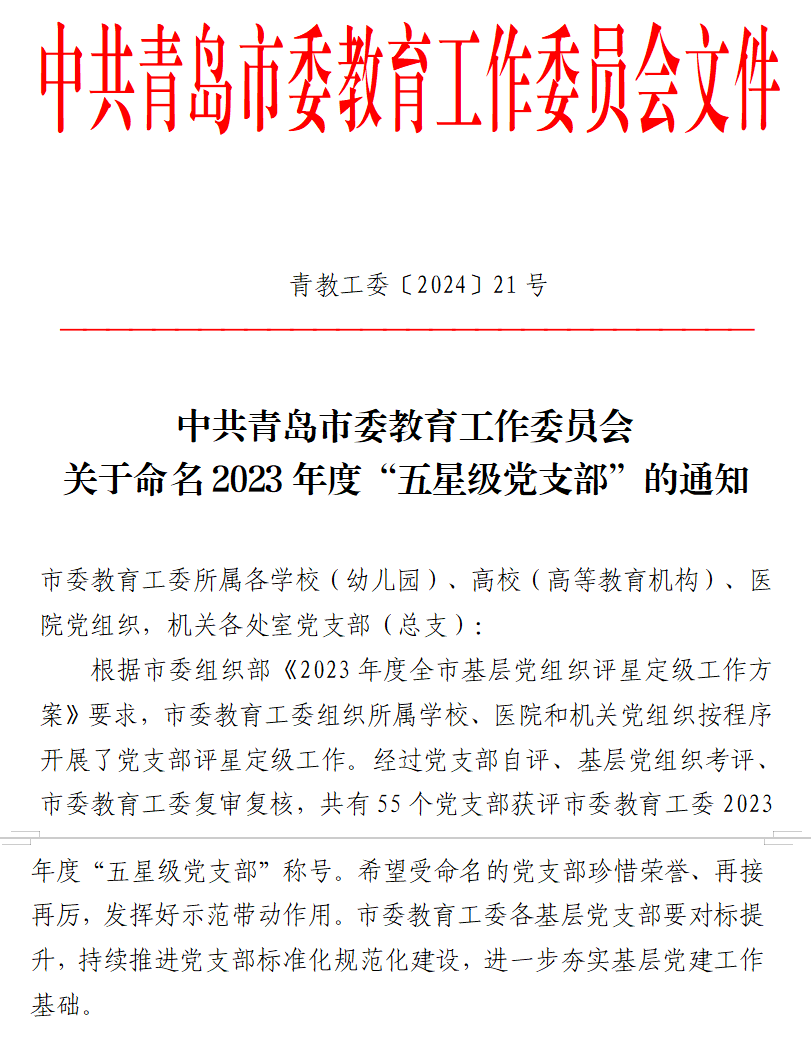 近日,中共青岛市委教育工委下发《关于命名2023年度“五星级党支部”的通知》,我校马克思主义学院教师第一党支部、智能制造学院教师第二党支部、教育学院教师党支部、医学院教师党支部4个党支部荣获2023年度“五星级党支部”荣誉称号(共55个),这是对我校年度党建工作的肯定和认可。