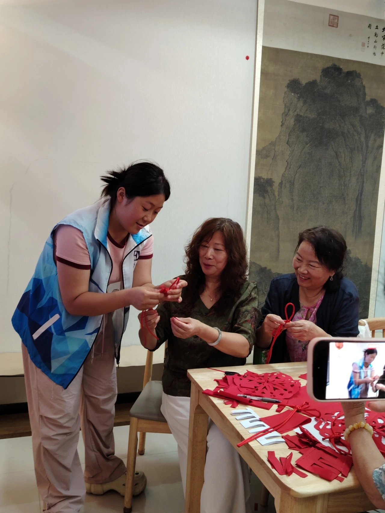 活动现场,志愿者们耐心地为老人们讲解中国结的制作方法。五彩的丝线在手中穿梭,如同灵动的音符,奏响了一曲对祖国的赞歌。老人们专注地聆听着,眼神中透露出好奇与认真。他们虽然年岁已高,但双手依然灵巧,在志愿者的指导下,不一会儿,一个个精美的中国结便在他们手中逐渐成形。