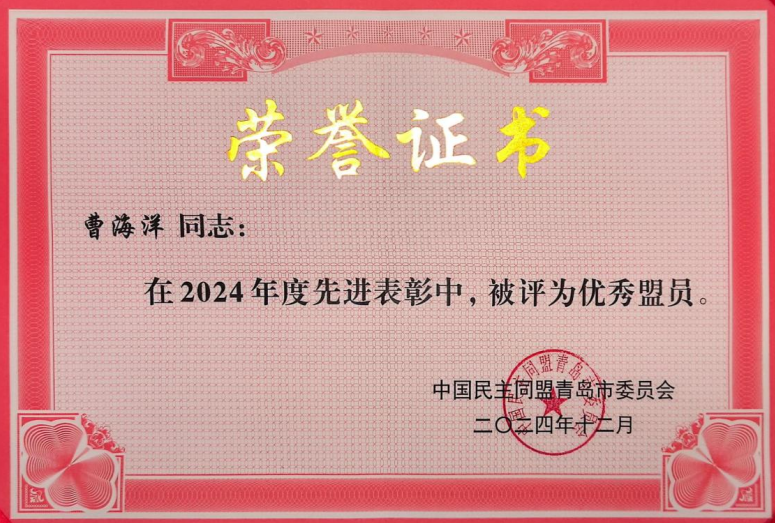 1月13日下午,民盟青岛市十四届六次全委会在青岛市民主党派机关召开。会上,表彰了2024年度先进集体和优秀盟员:民盟青岛黄海学院支部获“民盟青岛市委会2024年度先进基层组织”,我校民盟盟员曹海洋荣获“优秀盟员”称号。