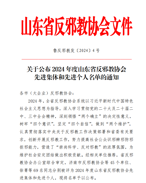 近日,山东省反邪教协会下发《关于公布2024年度山东省反邪教协会先进集体和先进个人名单的通知》,我校反邪教协会副秘书长、机关一党总支组织统战委员臧运霞老师被授予“先进个人”荣誉称号。