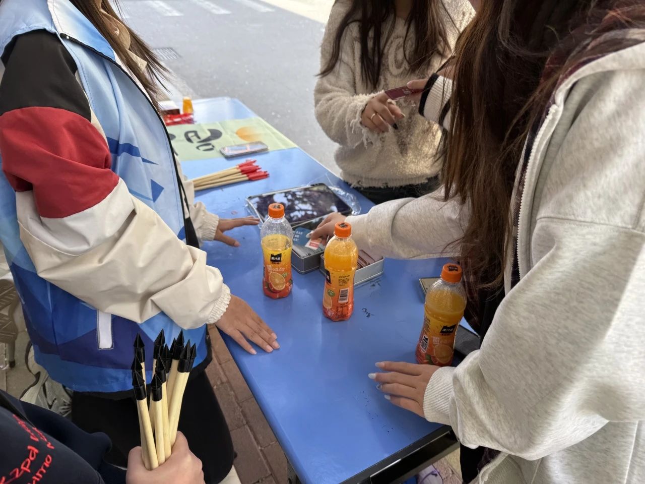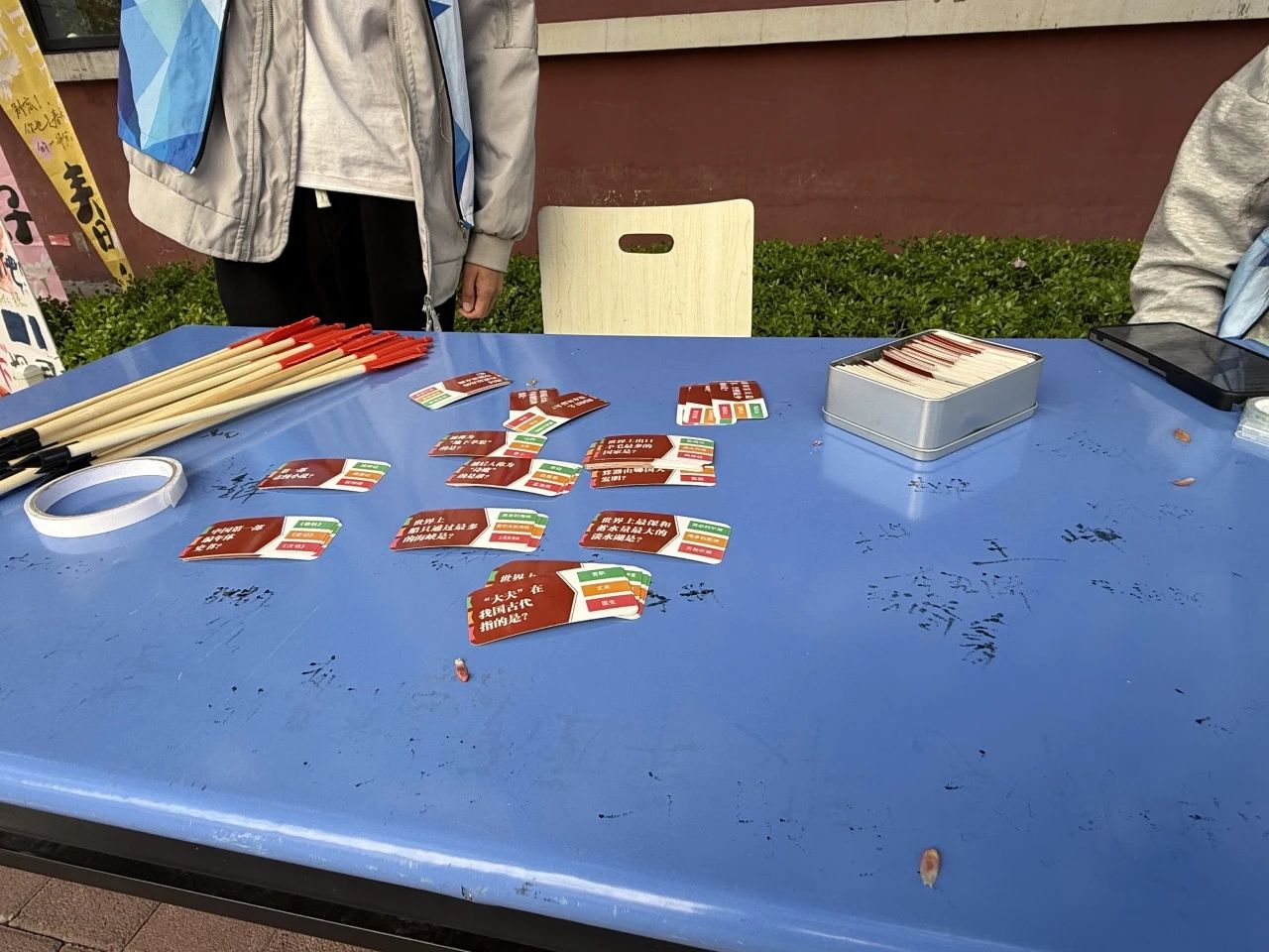 志愿者们就扛着海报、提着装满卡片的纸箱来到现场。春日的风还有些凉,但大家干劲十足,挂横幅、摆桌椅、调试音响,不一会儿,原本空旷的广场就“长”出了历史趣卡展示长廊、答题区和奖品兑换台。看着精心设计的卡片整齐排列,突然意识到,我们正用这种方式,将千年历史文化浓缩成触手可及的“盲盒”。