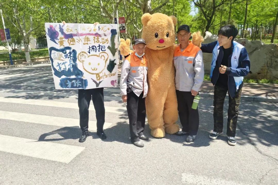 当第一缕阳光爬上教学楼的窗台,一只黄油小熊停在熙熙攘攘的体育馆的路口。路过的同学先是好奇地驻足,继而被小熊憨态可掬的招手动作逗笑。犹豫片刻后,一位女生轻轻上前,投入那团毛茸茸的怀抱。小熊温柔地拍了拍她的背,这一刻,所有早起的困倦与课业的压力,仿佛都被这温暖的拥抱揉碎,化作嘴角的一抹笑意。