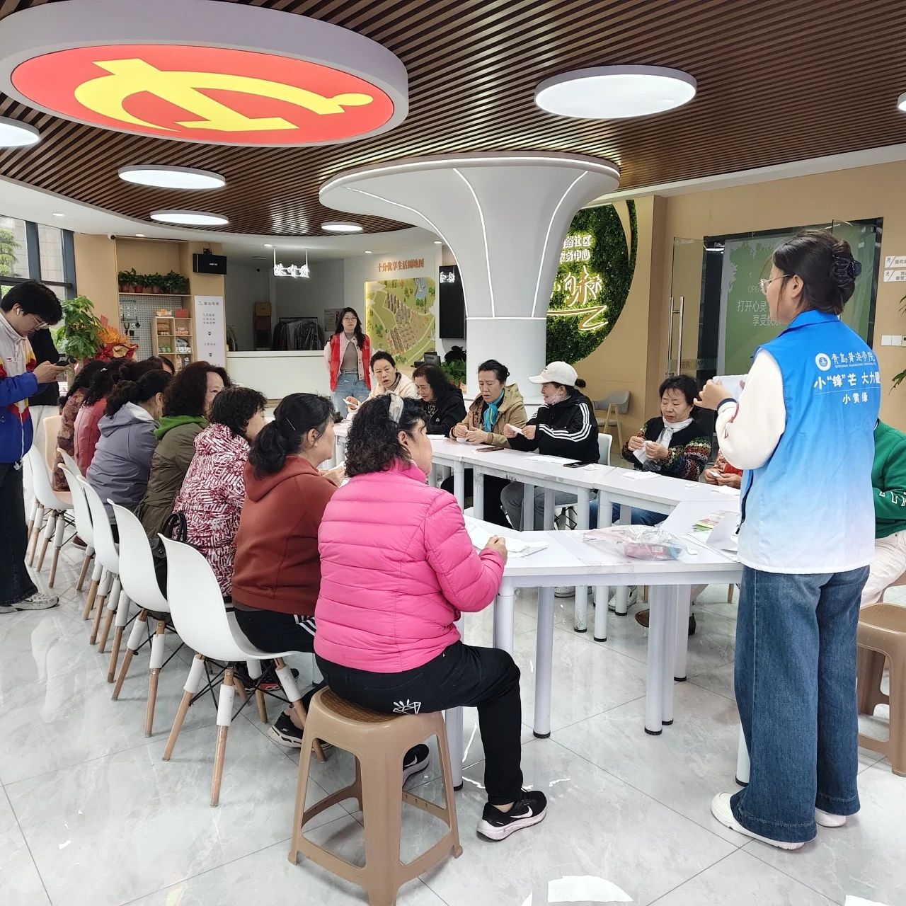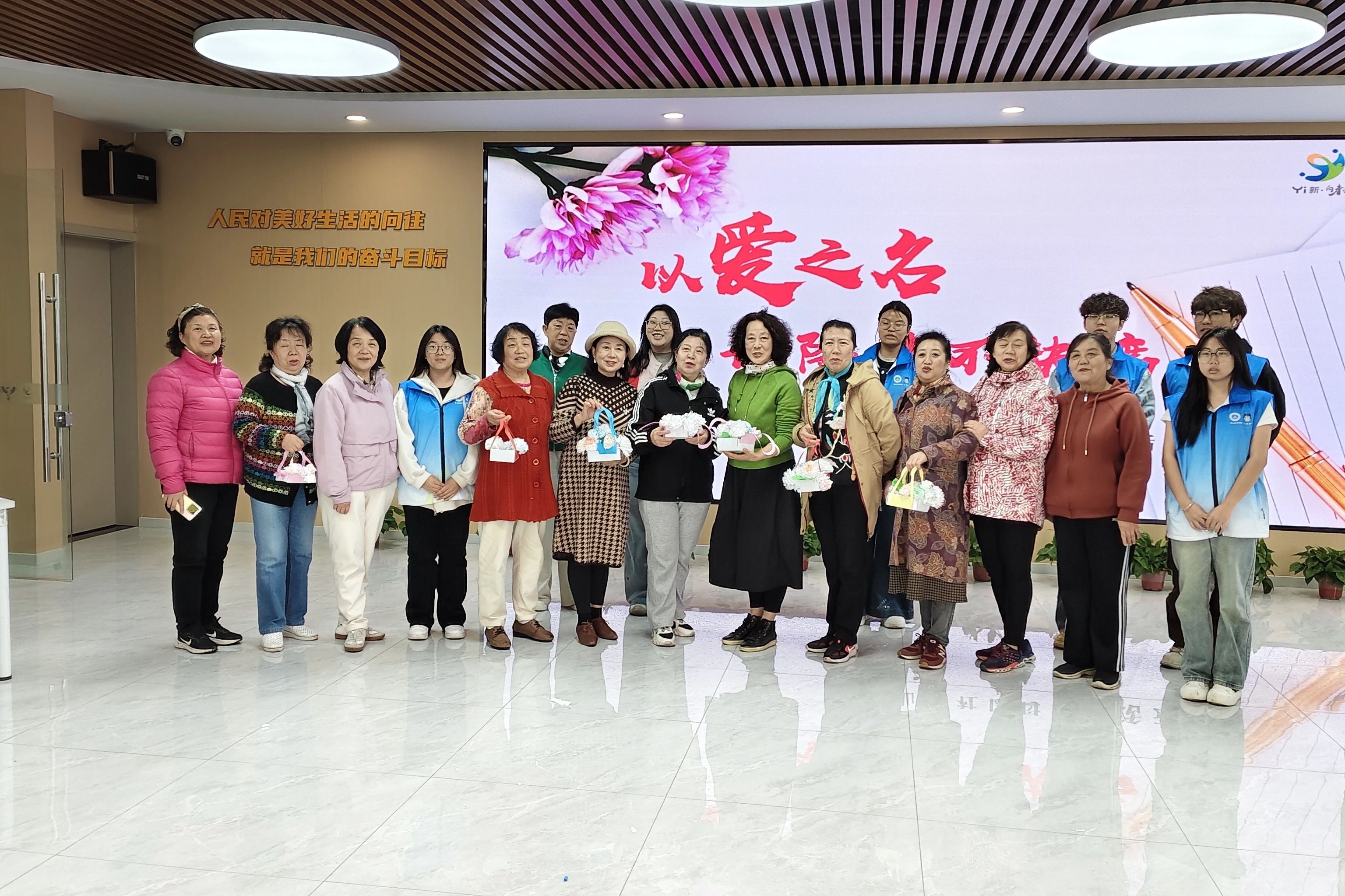 当康乃馨花篮制作完成,志愿者们手捧着这些承载着爱与祝福的作品,走到社区居民身边。他们将康乃馨轻轻递到居民手中,同时鼓励大家用文字写下对母亲的心里话,或是通过拥抱等肢体语言表达对母亲的感恩。现场氛围温馨而热烈“小黄锋”志愿者们始终以饱满的热情和细致的服务,陪伴着每一位参与者。