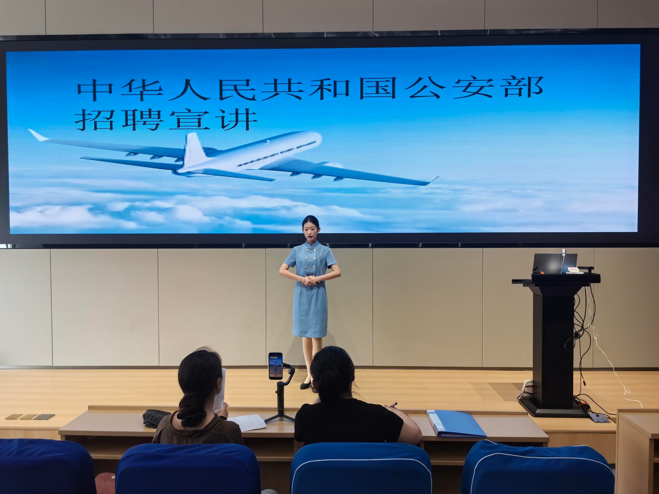 公安部招聘工作组详细介绍了招聘岗位、应聘条件及福利待遇,并分享了职业发展路径与工作内容。同学们对公安系统的就业机会表现出浓厚兴趣,现场互动积极。 宣讲结束后,公安部工作组对报名学生进行了资格审核与面试。同学们踊跃参与,展现了空乘学子的专业素养与求职热情。