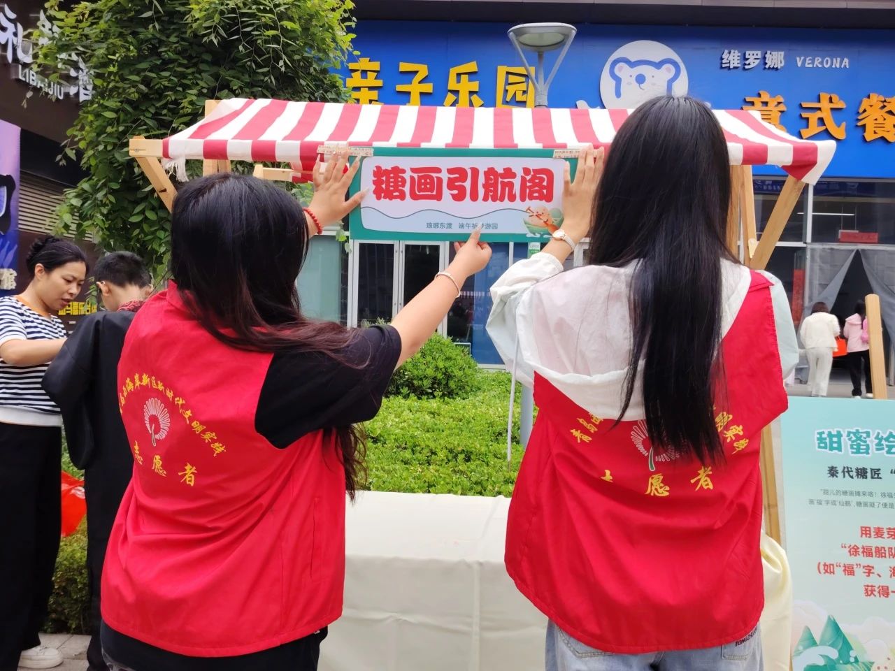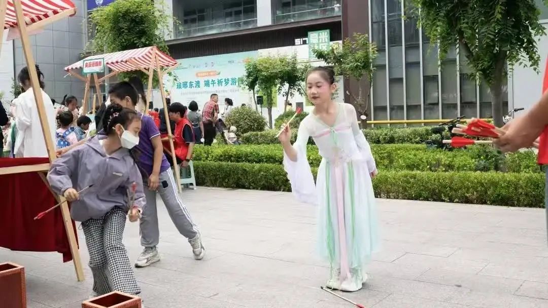 十大民俗技艺与端午习俗摊位,是本次活动的亮点所在。“小黄锋”志愿者们分散在各个摊位前,为居民们提供一对一的贴心协助。五彩手绳编织摊前,他们手把手教小朋友打结、缠绕,让寓意吉祥的手绳在指尖诞生;非遗技艺摊位前,志愿者们同样忙得不亦乐乎。剪纸区里,他们帮忙铺展红纸、递送剪刀,协助居民剪出精美的祥瑞窗花;面塑摊旁,手把手教孩子们揉捏塑形,让各色面团变成栩栩如生的可爱瑞兽;糖画摊位上,协助艺人稳住石板、传递工具,看着滚烫的糖浆在居民手中勾勒出灵动图案;拓印区域,志愿者们仔细地帮大家铺宣纸、刷墨汁,当古朴的文字图案缓缓显现,历史的厚重感与文化的传承魅力扑面而来。