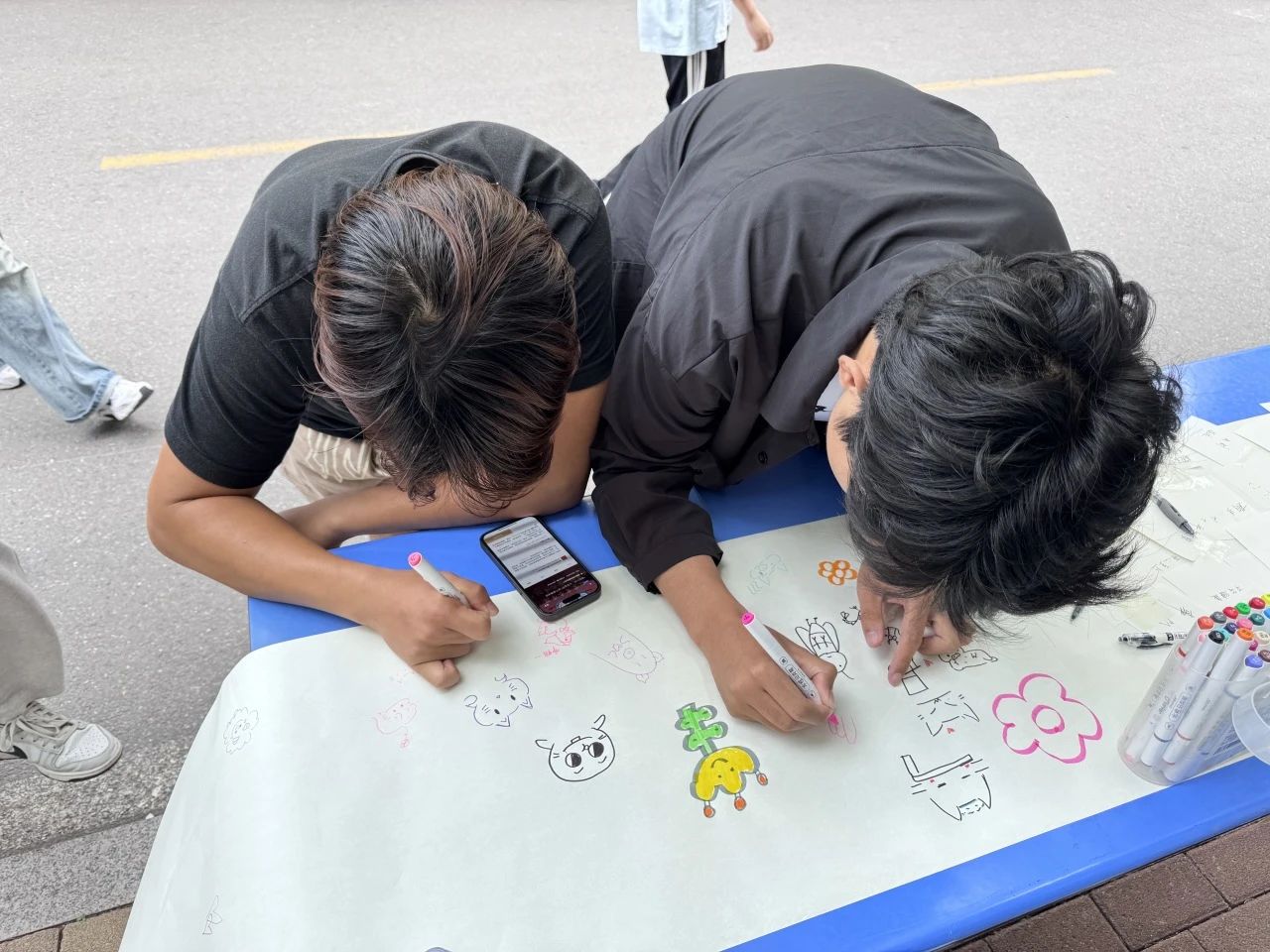 创作完成后,“小黄锋”志愿者们引导同学们将承载着思绪与情感的便利贴,轻轻粘贴到涂鸦墙的纸板上。一张张便利贴如同缤纷的花瓣,渐渐汇聚成一幅独一无二的“心灵画卷”。“愿所有努力都有回报”“别担心,一切都会好起来”,一句句真挚的话语,一幅幅生动的涂鸦,共同诉说着青春的故事。此次校园心理健康日志愿活动,“小黄锋”志愿者协会用行动诠释了公益的力量,通过互动形式普及心理知识,在预防心理问题、解决心理困扰的道路上,为同学们点亮了一盏明灯。未来,“小黄锋”们将继续带着这份温暖与爱,在校园的每个角落传递正能量,守护每一颗年轻而美好的心灵!