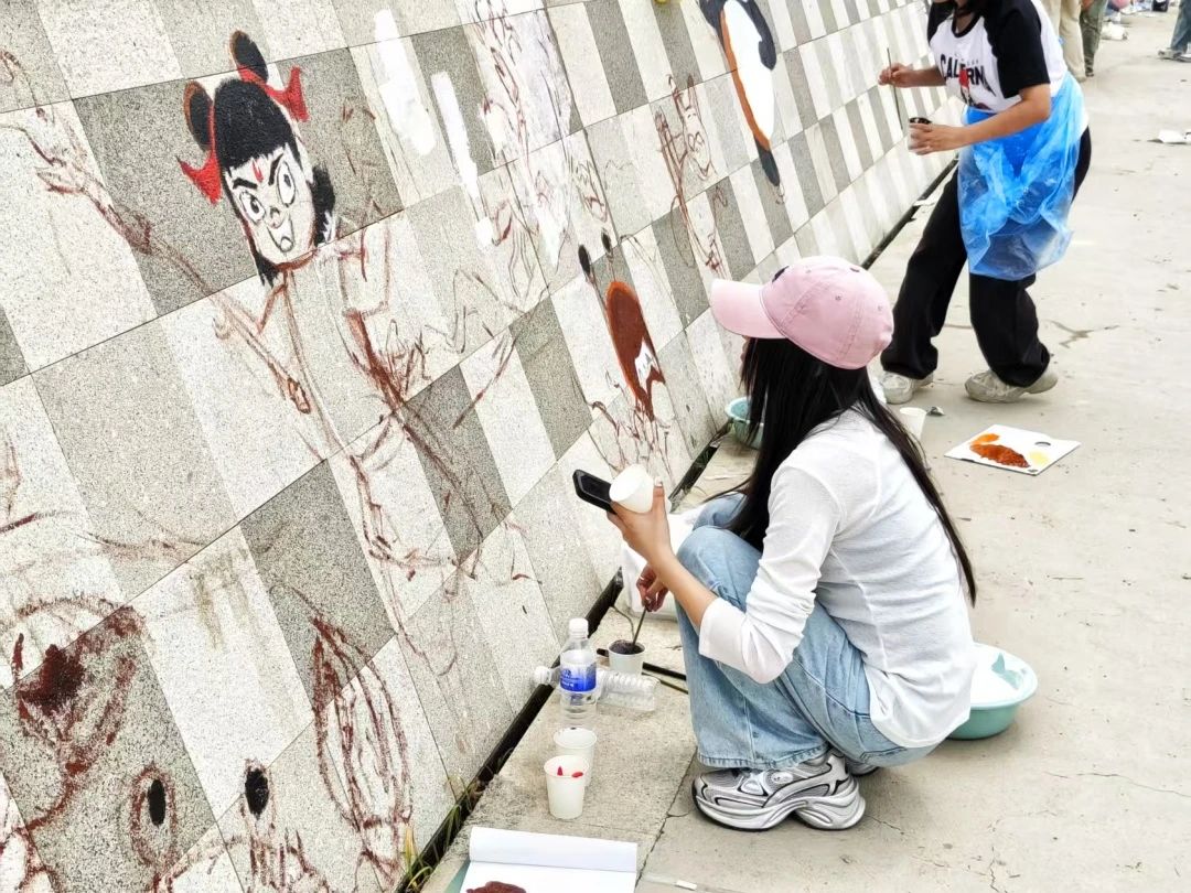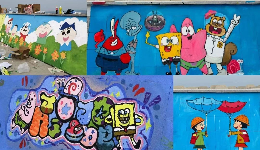 创作环节中,志愿者们充分发挥自己的兴趣与特长,自由选择主题板块进行绘画。有的描绘出蓝天白云下的美丽海岛风光,有的勾勒出可爱灵动的海洋生物,还有的用抽象的色彩表达对美好生活的向往。现场气氛热烈而欢快,画笔在墙面上飞舞,颜料在空气中飘散,每一笔都饱含着志愿者们的热情与创意。期间,指导老师不时巡回指导,为志愿者们提供专业建议,帮助大家更好地完成作品。在老师的点拨下,原本稍显稚嫩的画作变得更加生动、立体,一幅幅精彩的作品在大坝上逐渐成型。